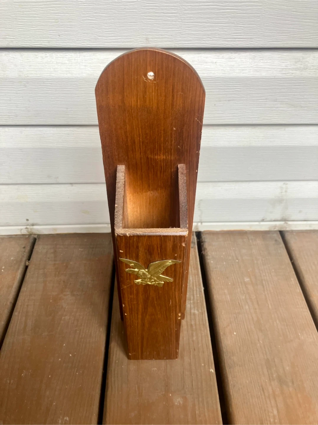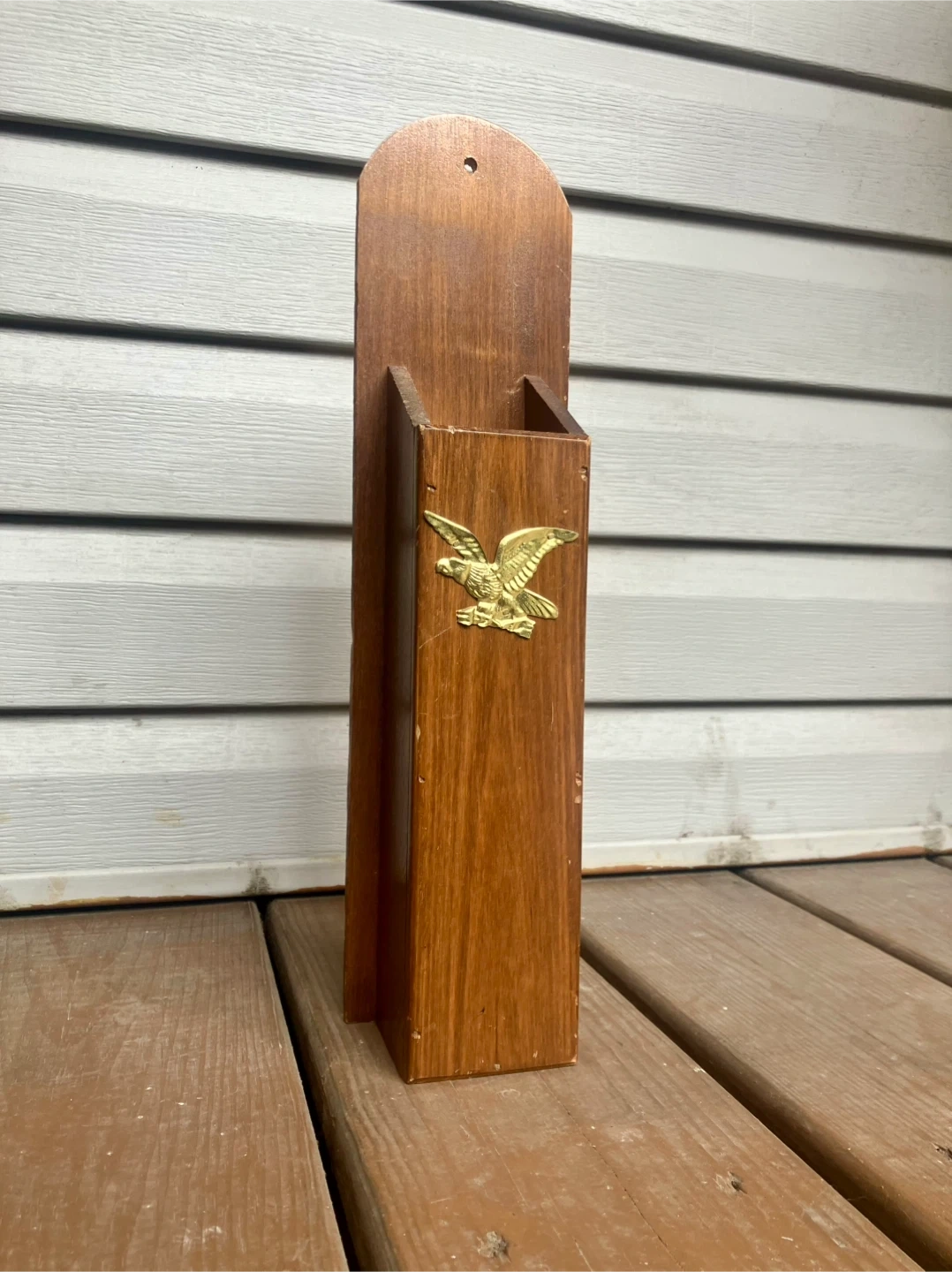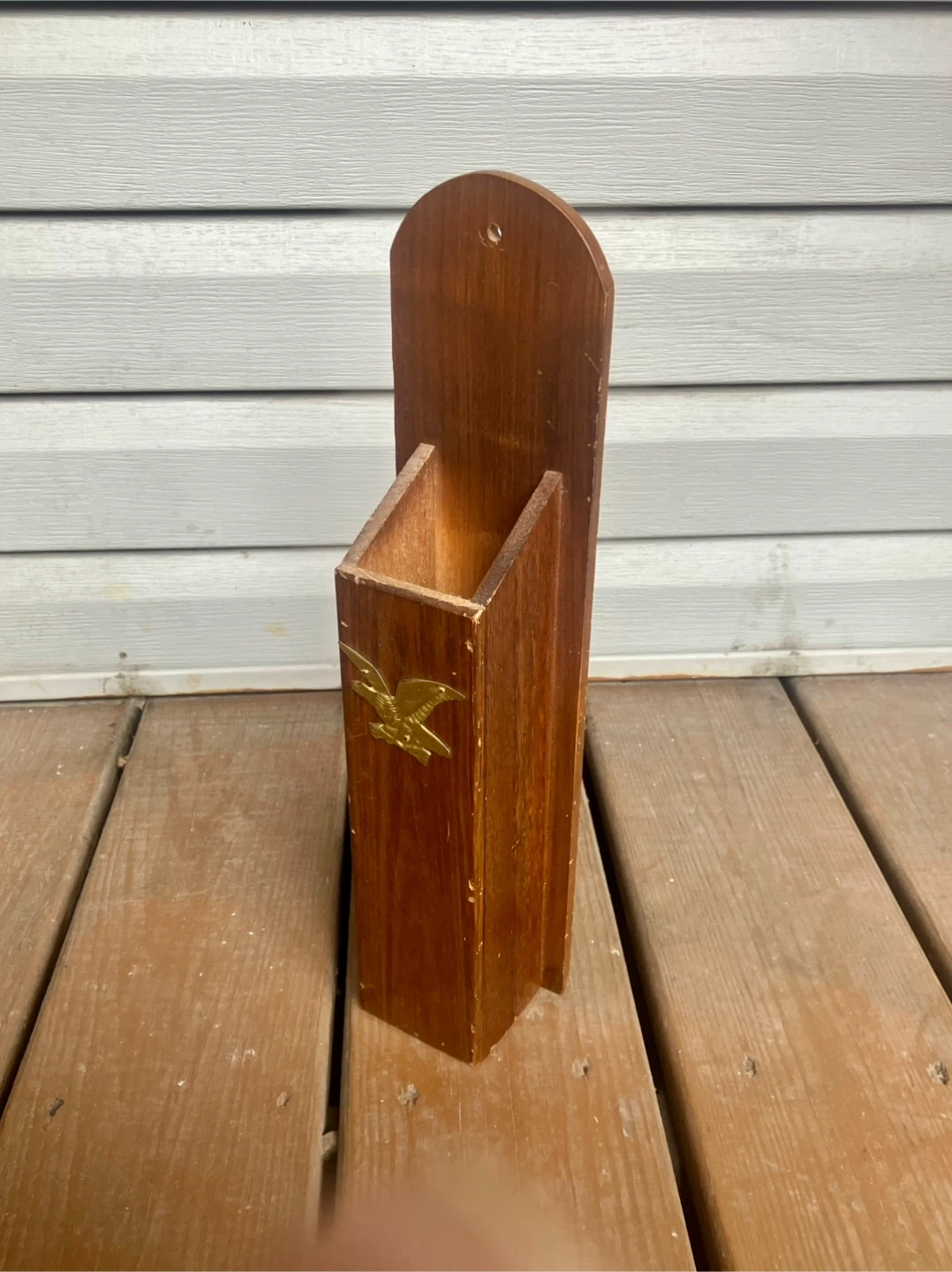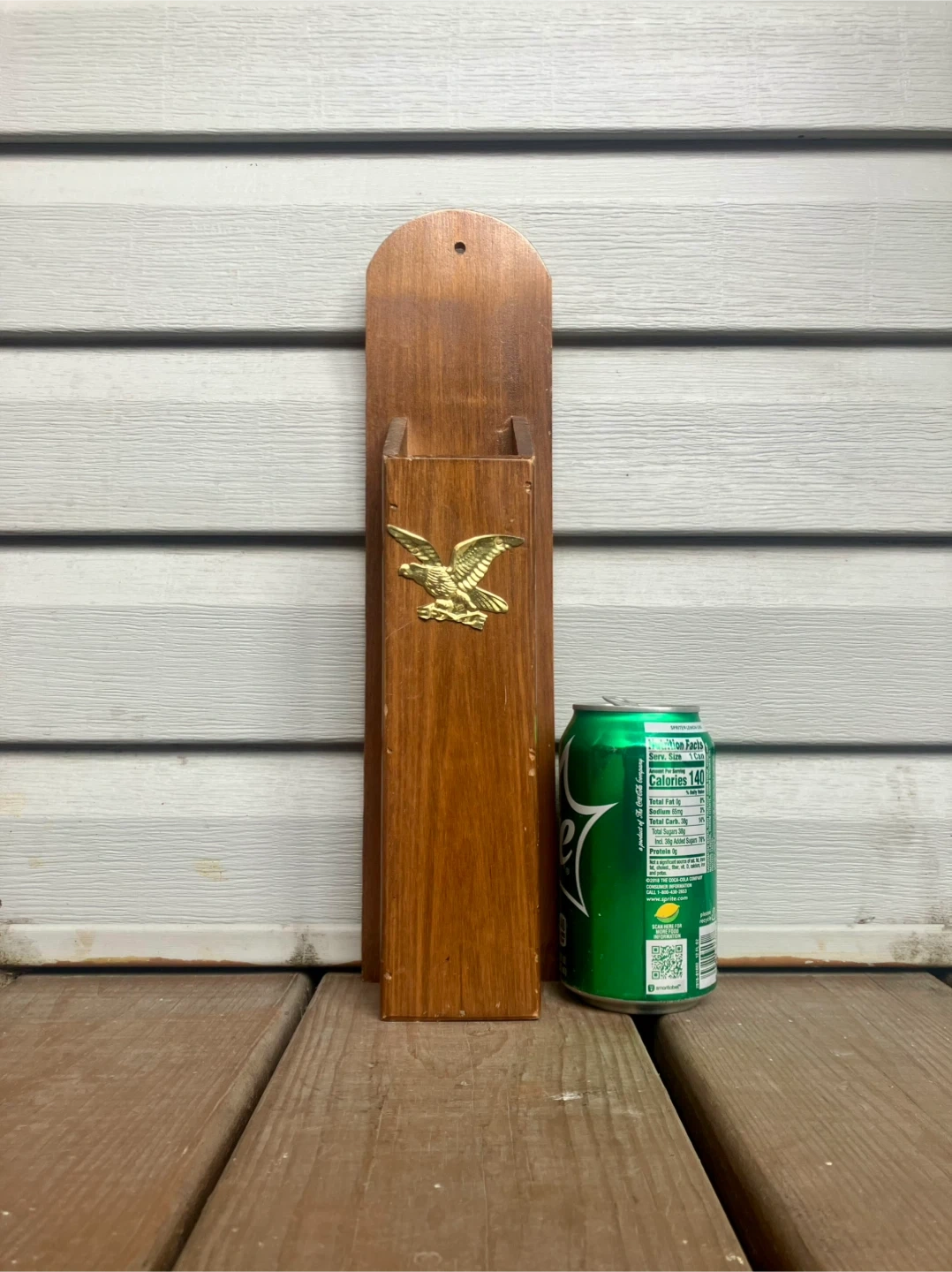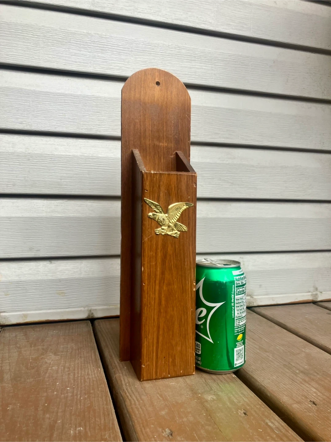 94Vintage Wood Fireplace Match Holder - 14” x 3.5” This is a vintage fireplace match holder embossed with a metal gold toned eagle. Very good condition with normal wear for its age. There is a hole at the top of unit for easy mounting. Bottom striker pad for lighting matches. Measures 14” tall x 3.5” wide. From a smoke and pet free home. Check out in person before purchasing. Thanks for looking.