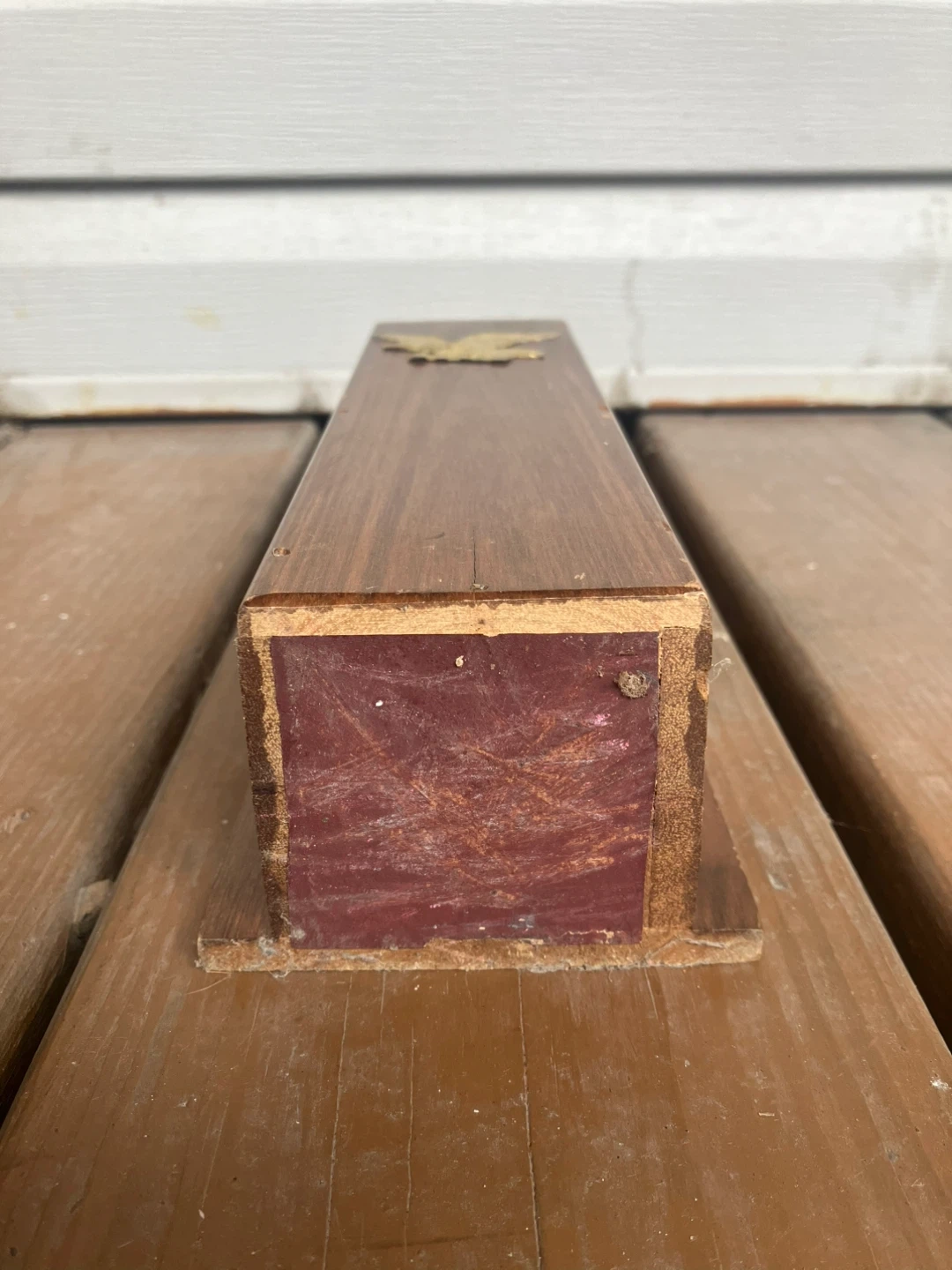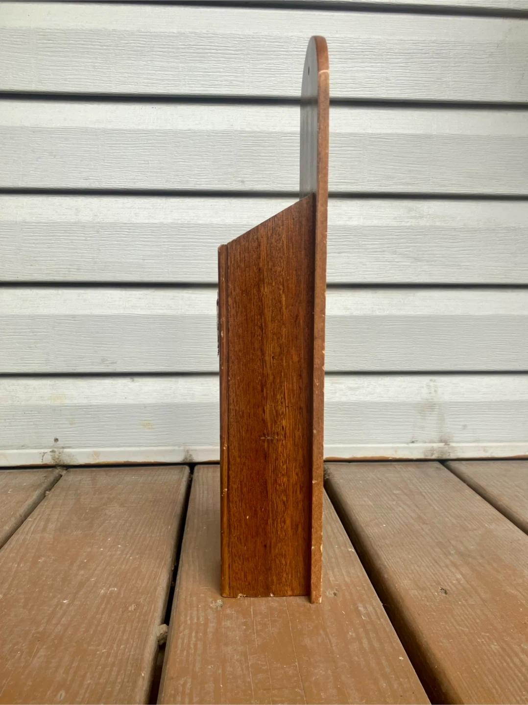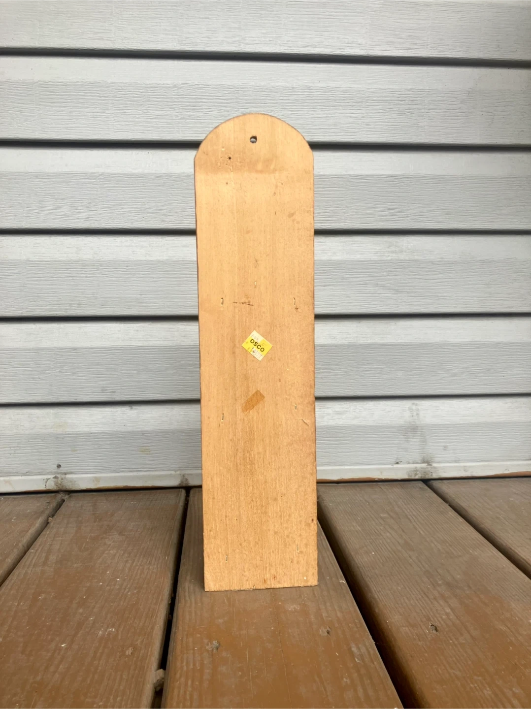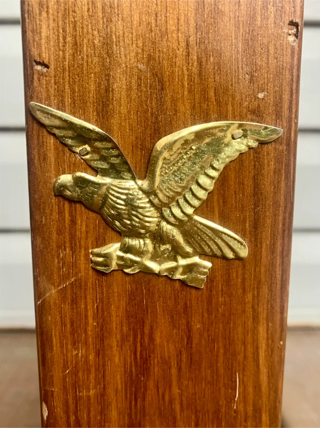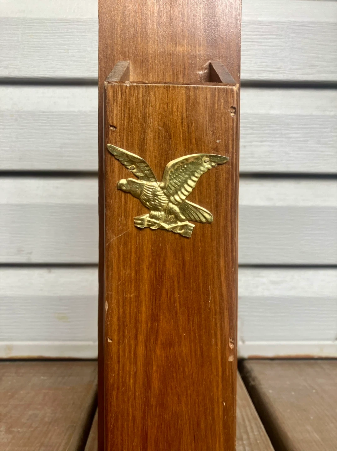 94Vintage Wood Fireplace Match Holder - 14” x 3.5” This is a vintage fireplace match holder embossed with a metal gold toned eagle. Very good condition with normal wear for its age. There is a hole at the top of unit for easy mounting. Bottom striker pad for lighting matches. Measures 14” tall x 3.5” wide. From a smoke and pet free home. Check out in person before purchasing. Thanks for looking.