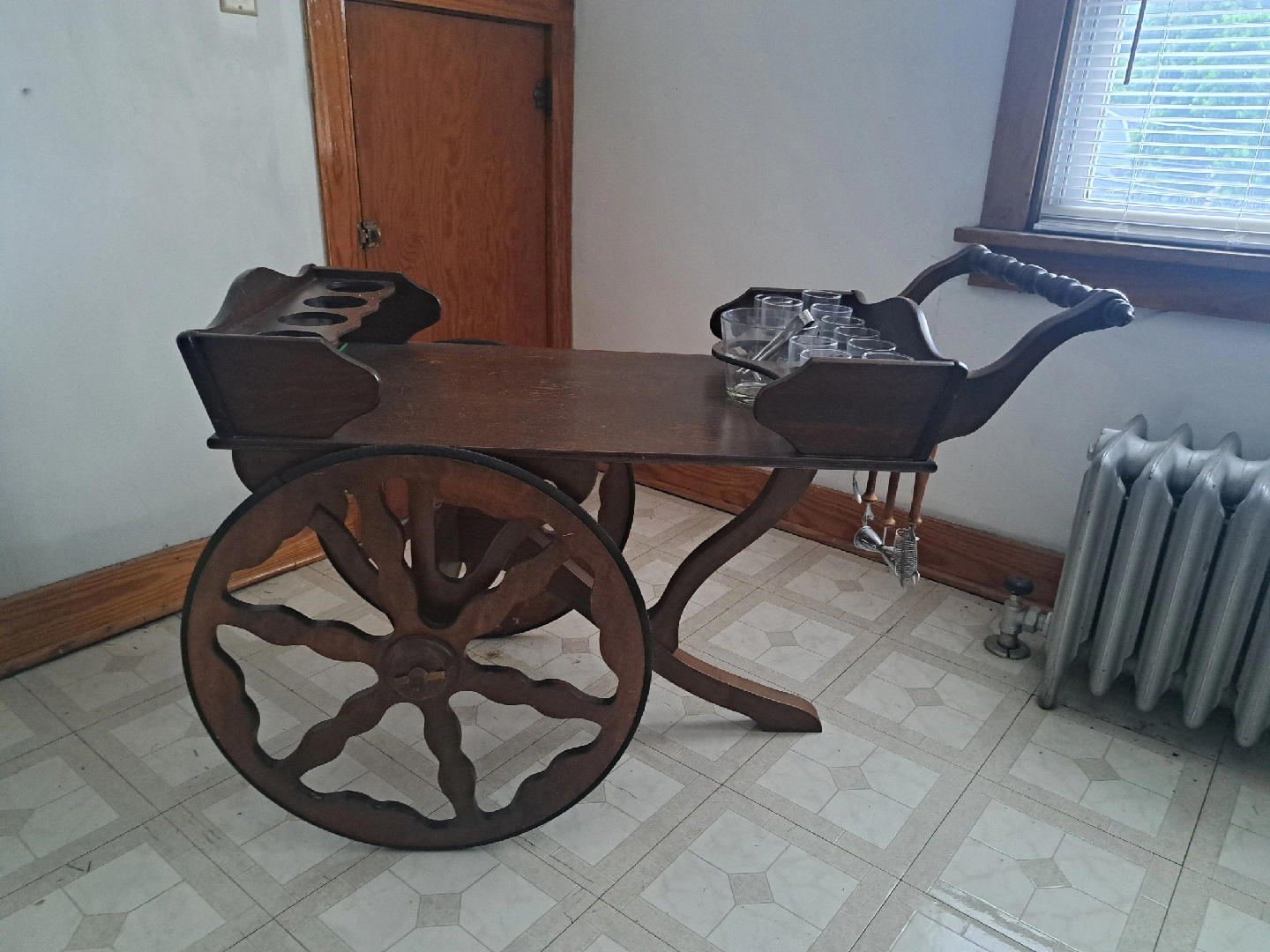 Selling a charming vintage wooden bar cart! It features a unique design with large wheels and a convenient handle for easy moving. Perfect for serving drinks and adding a touch of rustic elegance to your home