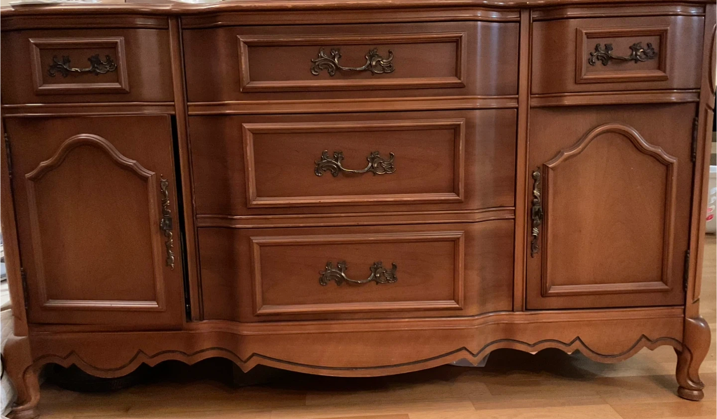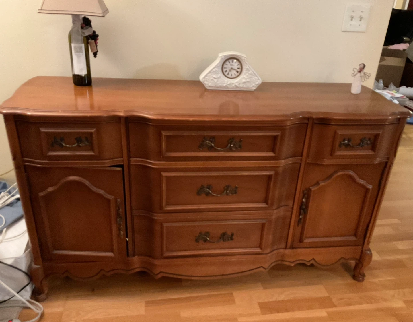 Selling a beautiful vintage wooden buffet/sideboard. It features intricate detailing and a classic design. Perfect for adding a touch of elegance to your dining room or living space. It has drawers and cabinets for storage