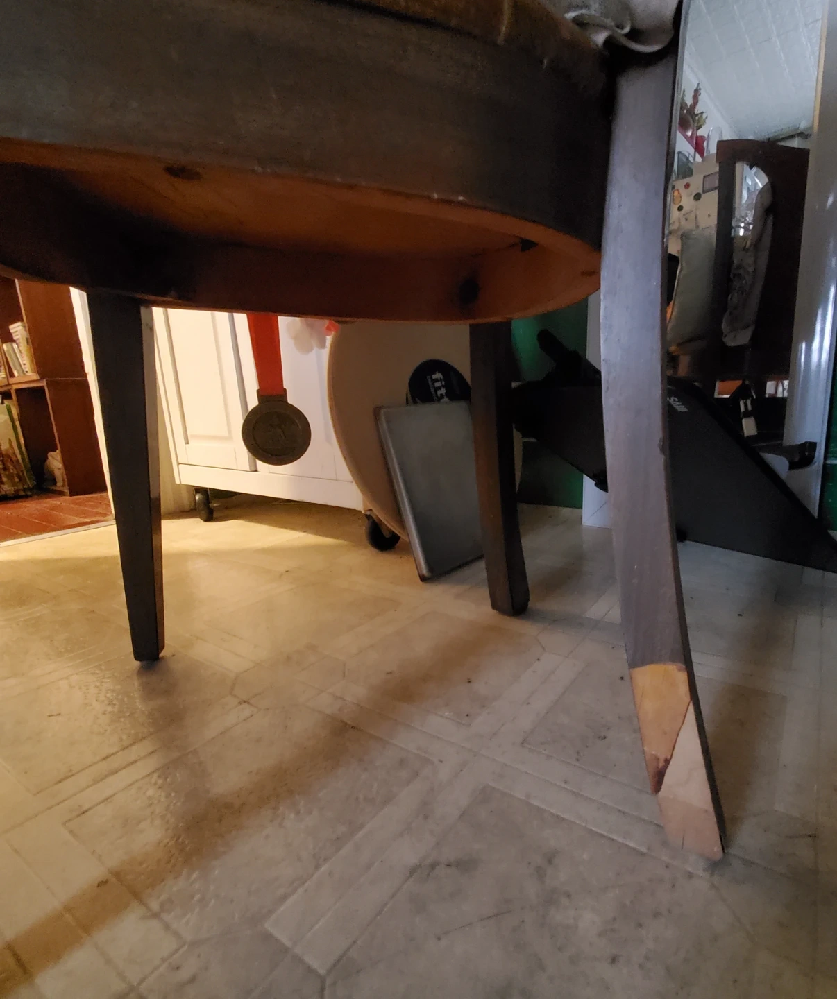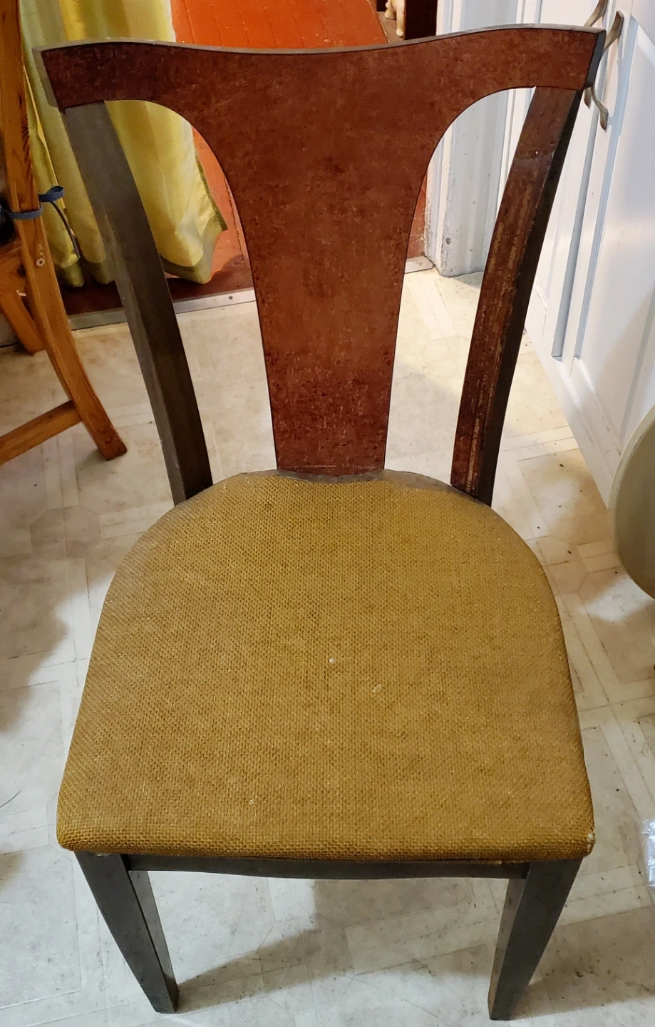 256Giving a vintage wooden dining chair. It has a brown wooden frame and a mustard yellow upholstered seat. It's a sturdy chair, perfect for adding a touch of retro charm to your dining area or kitchen. A spot on the back right leg is missing wood finish (as pictured).