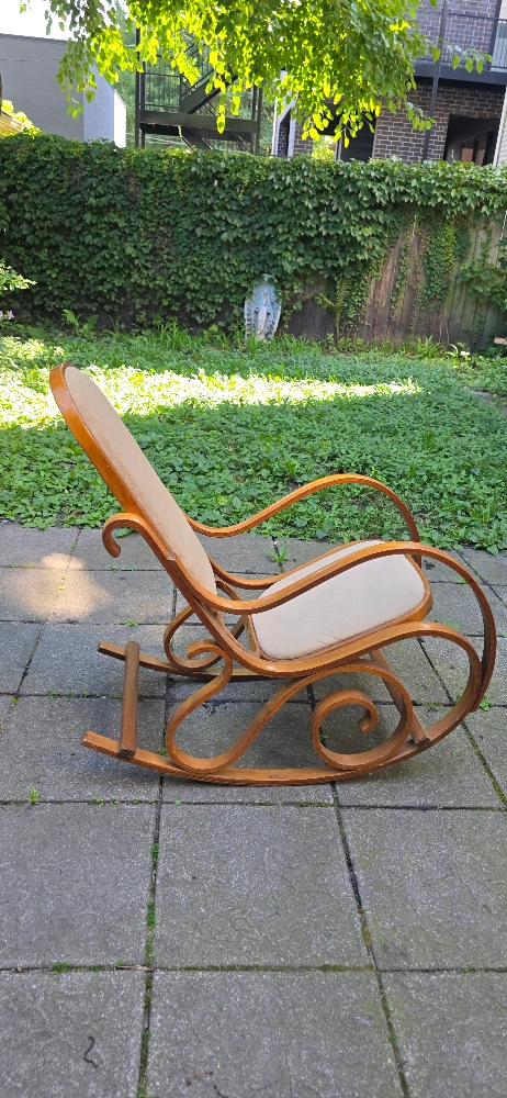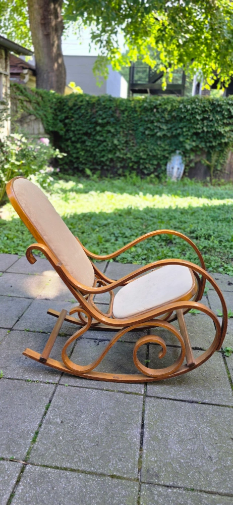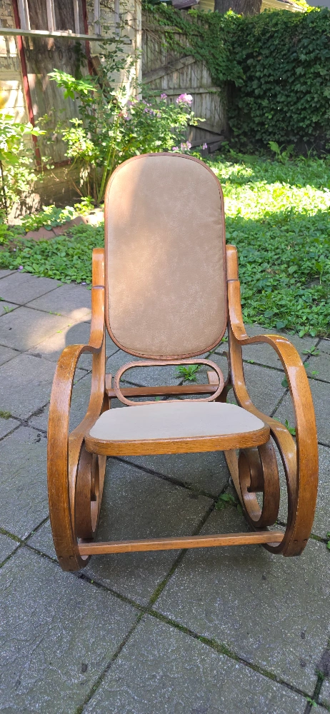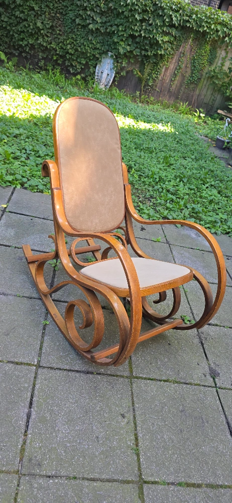 18This vintage wooden rocking chair has a classic design and is perfect for relaxing. It features a sturdy wooden frame with a comfortable upholstered seat and back. The chair has a warm, inviting look and would be a great addition to any home.