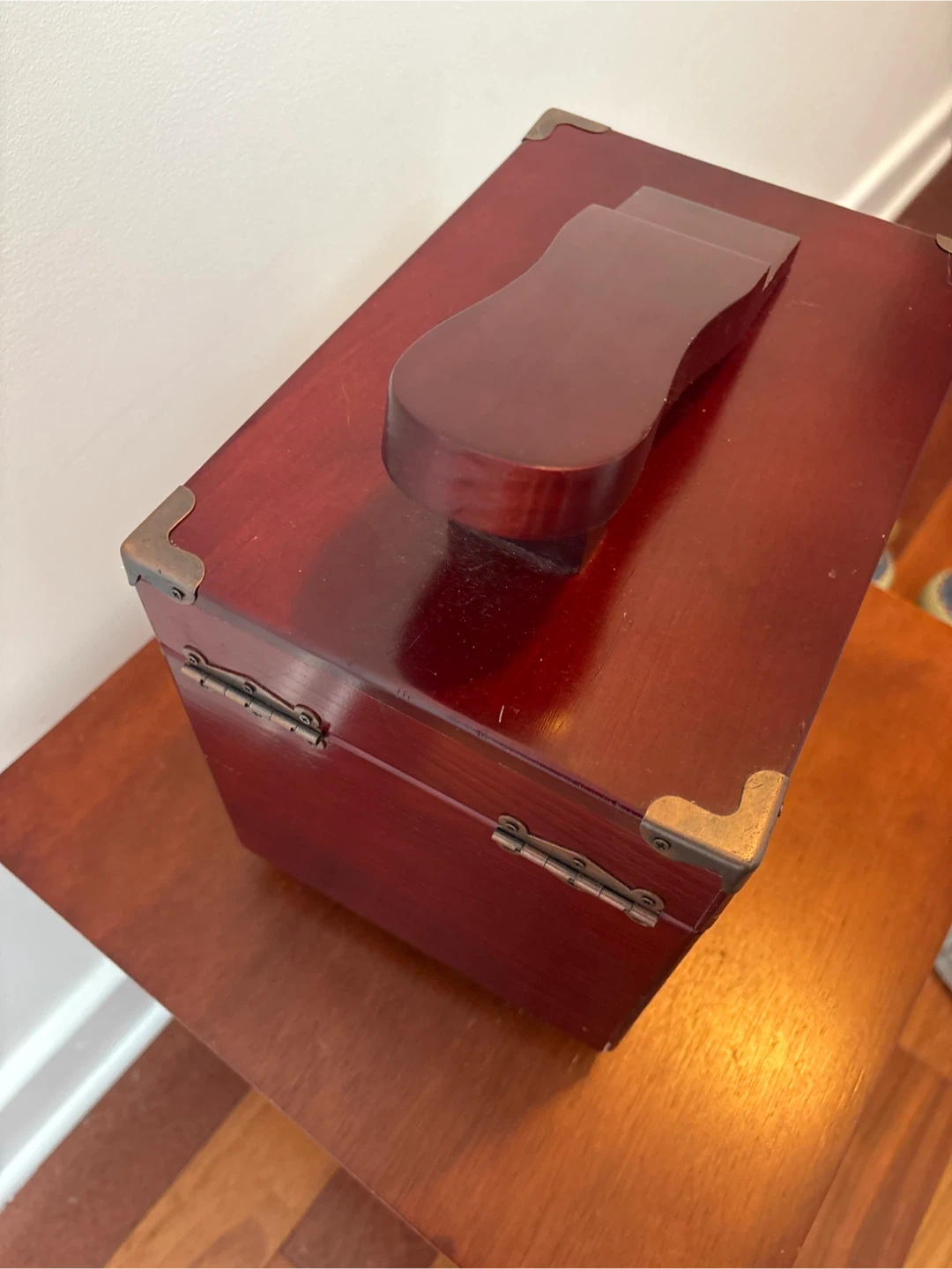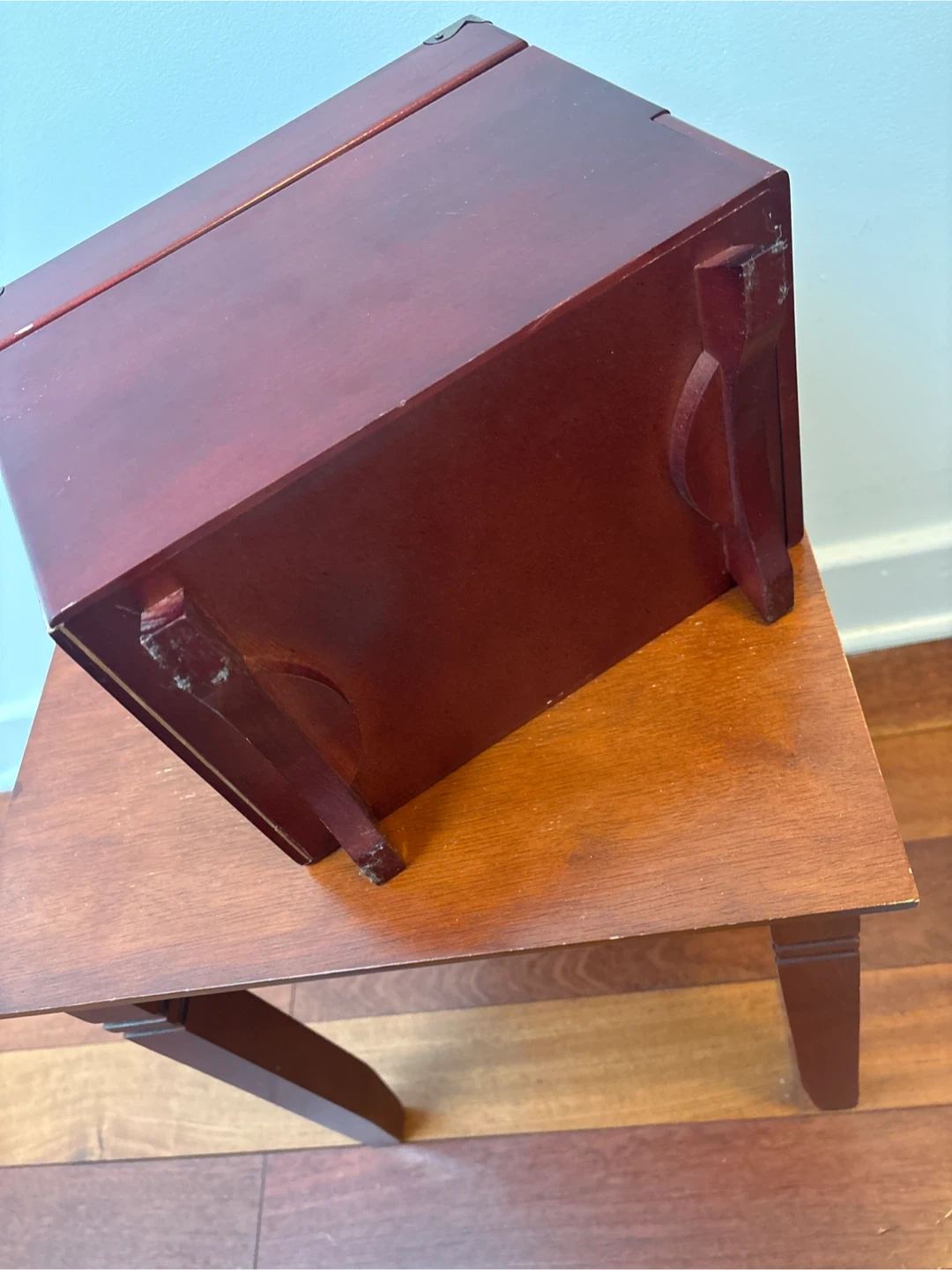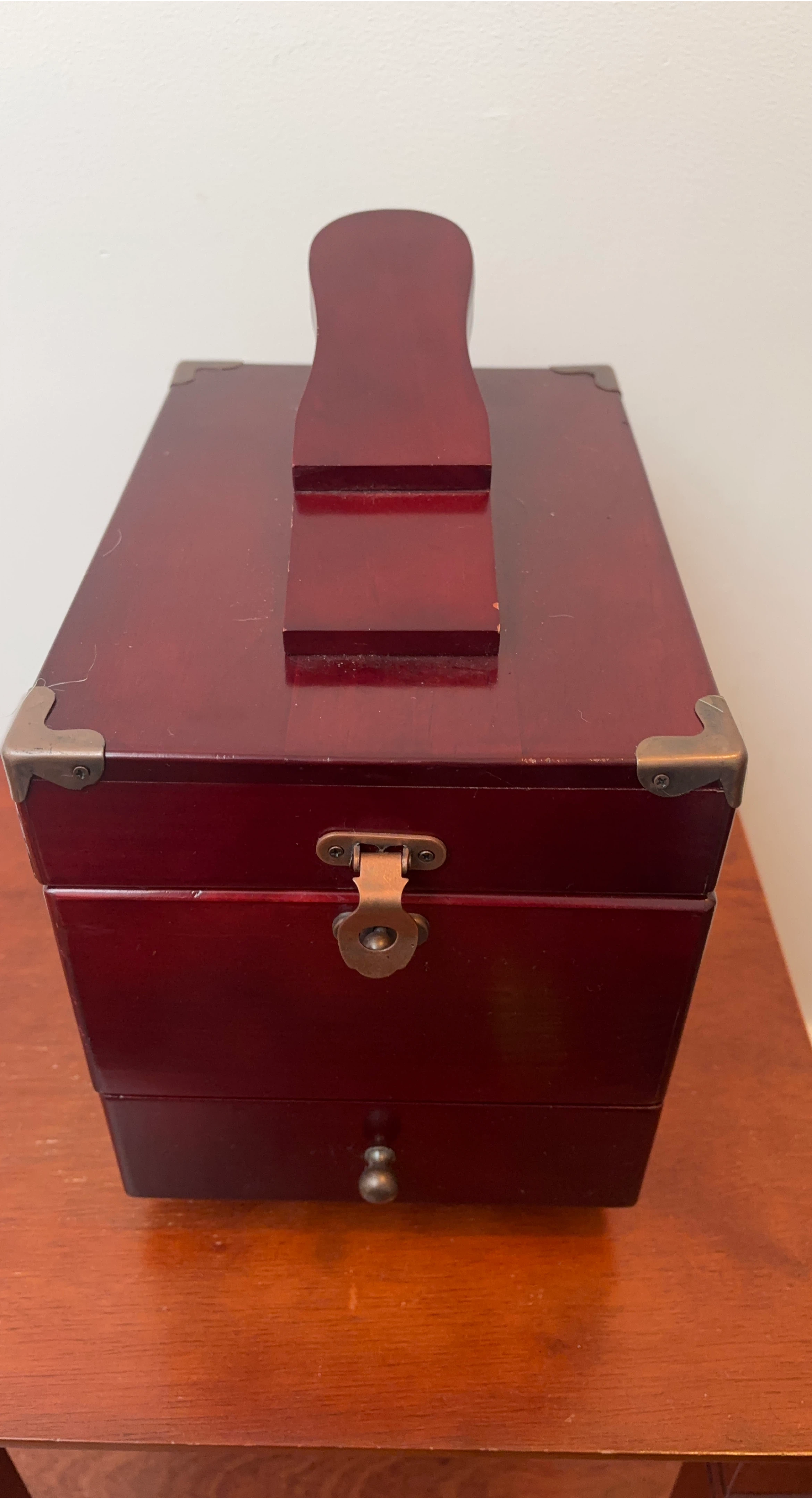 Selling a vintage wooden shoe shine box! It features a foot rest, storage compartment, and a small drawer for your polishes and brushes. Perfect for keeping your shoes looking their best! Depth 11 in , height 9.5 in width 7.5 in