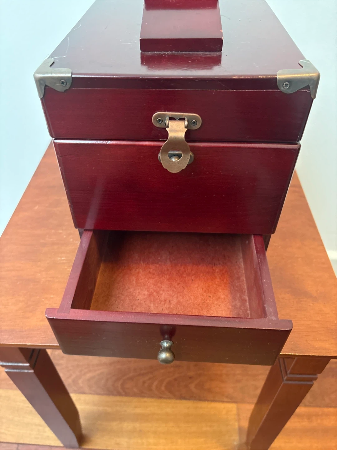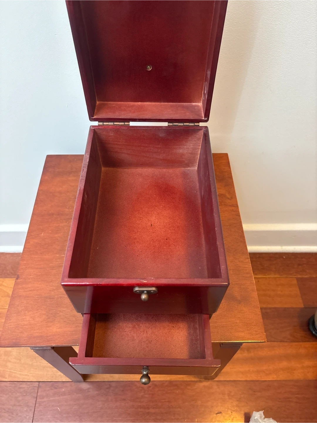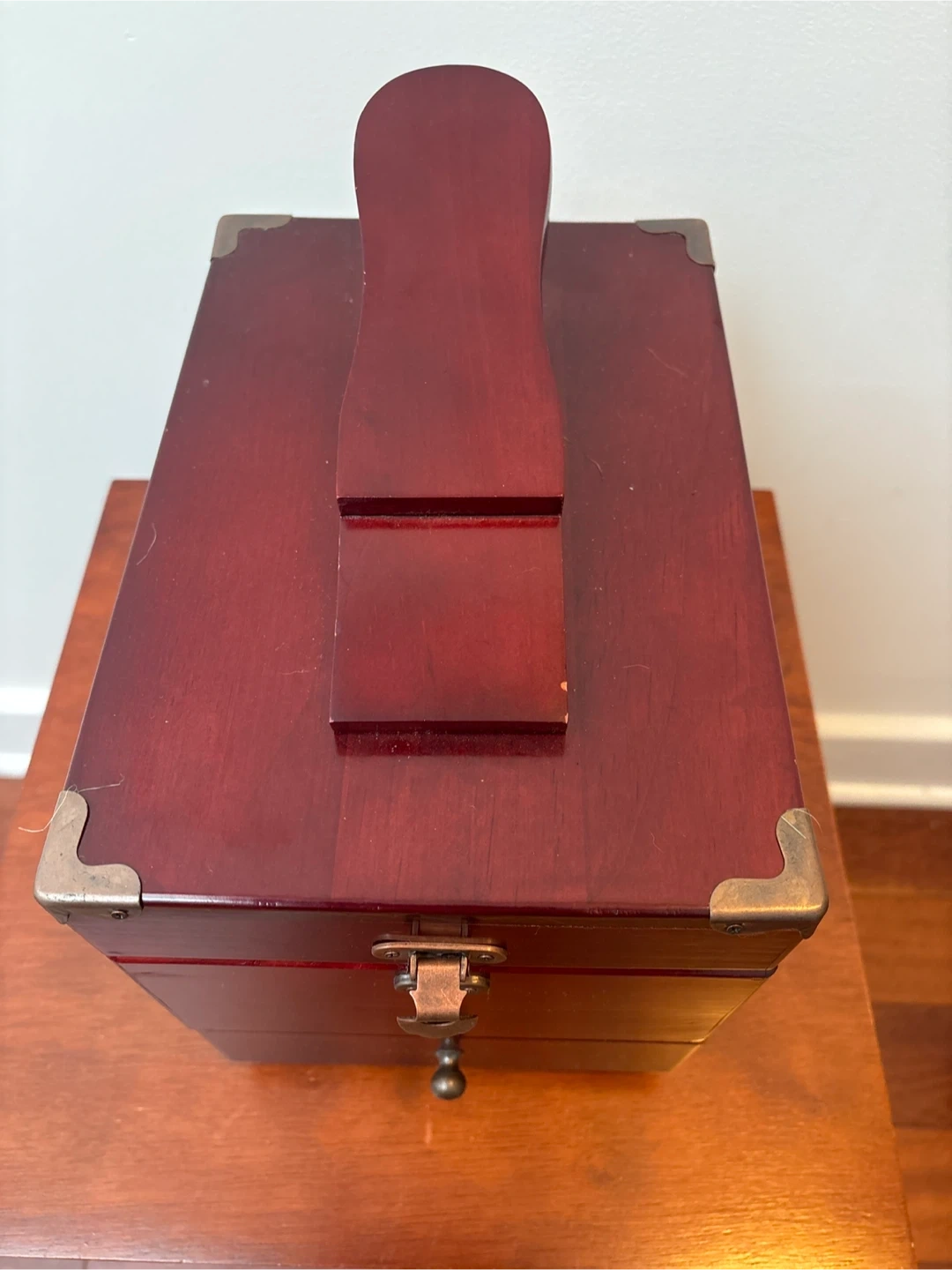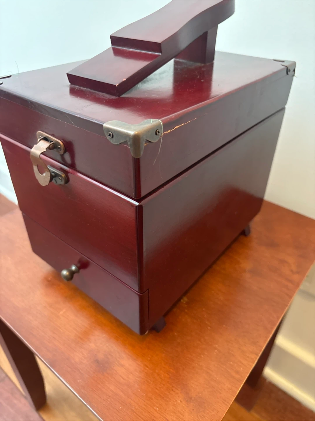 Selling a vintage wooden shoe shine box! It features a foot rest, storage compartment, and a small drawer for your polishes and brushes. Perfect for keeping your shoes looking their best! Depth 11 in , height 9.5 in width 7.5 in