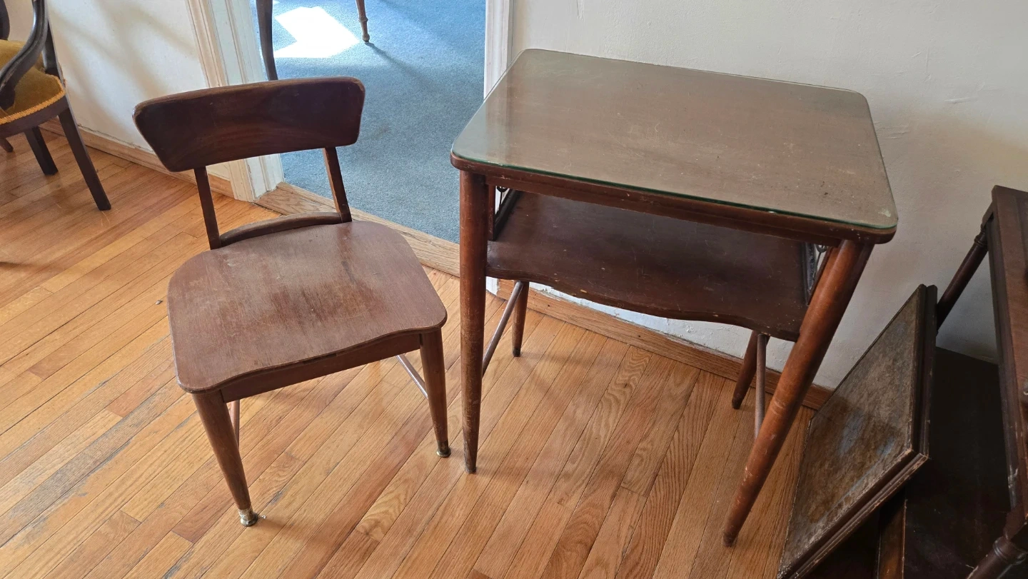 21Vintage telephone table and chair. Wood with glass table top. Pick up Huguenot, 10309 Selling a charming vintage wooden chair and side table set. Both pieces show some wear and character, perfect for adding a touch of retro style to your home. The chair has a classic design, and the side table features a glass top and a lower shelf for storage. They're sturdy and ready for a new home!