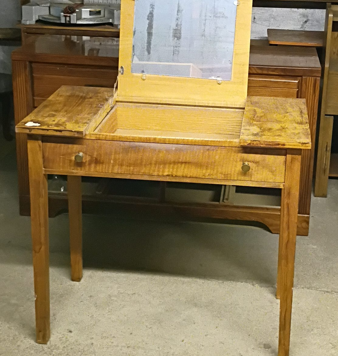 10Selling a vintage wooden vanity table with a mirror. It features a drawer and a lift-up top with a mirror inside. It shows some signs of wear and could use some refinishing, but it's a solid piece of furniture with a lot of character!