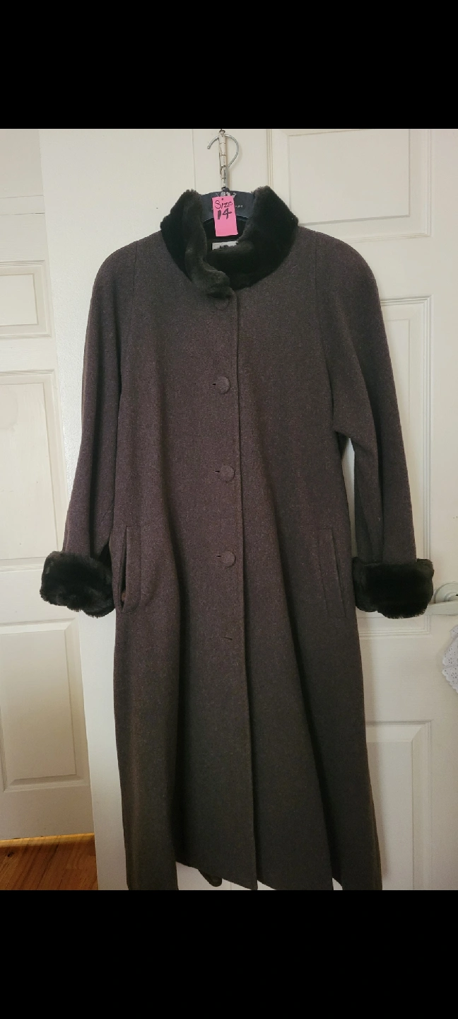Selling a beautiful vintage wool coat in a dark brown color! It features a stylish fur trim around the collar and cuffs. The coat is a women's size 14. It's in great condition and ready for a new home!
