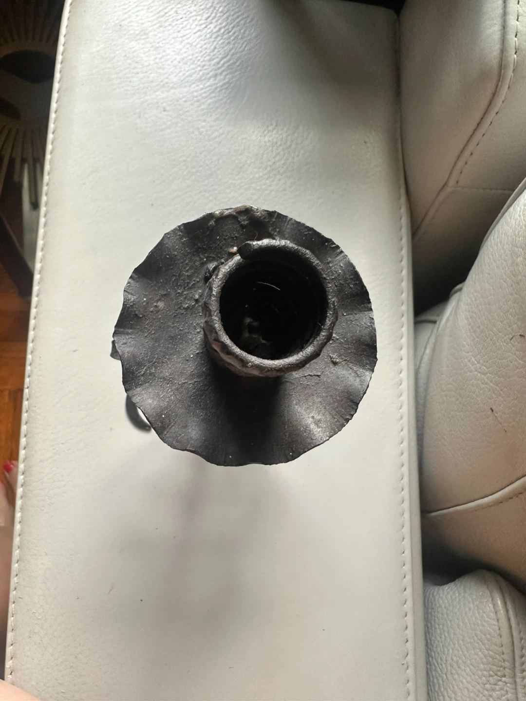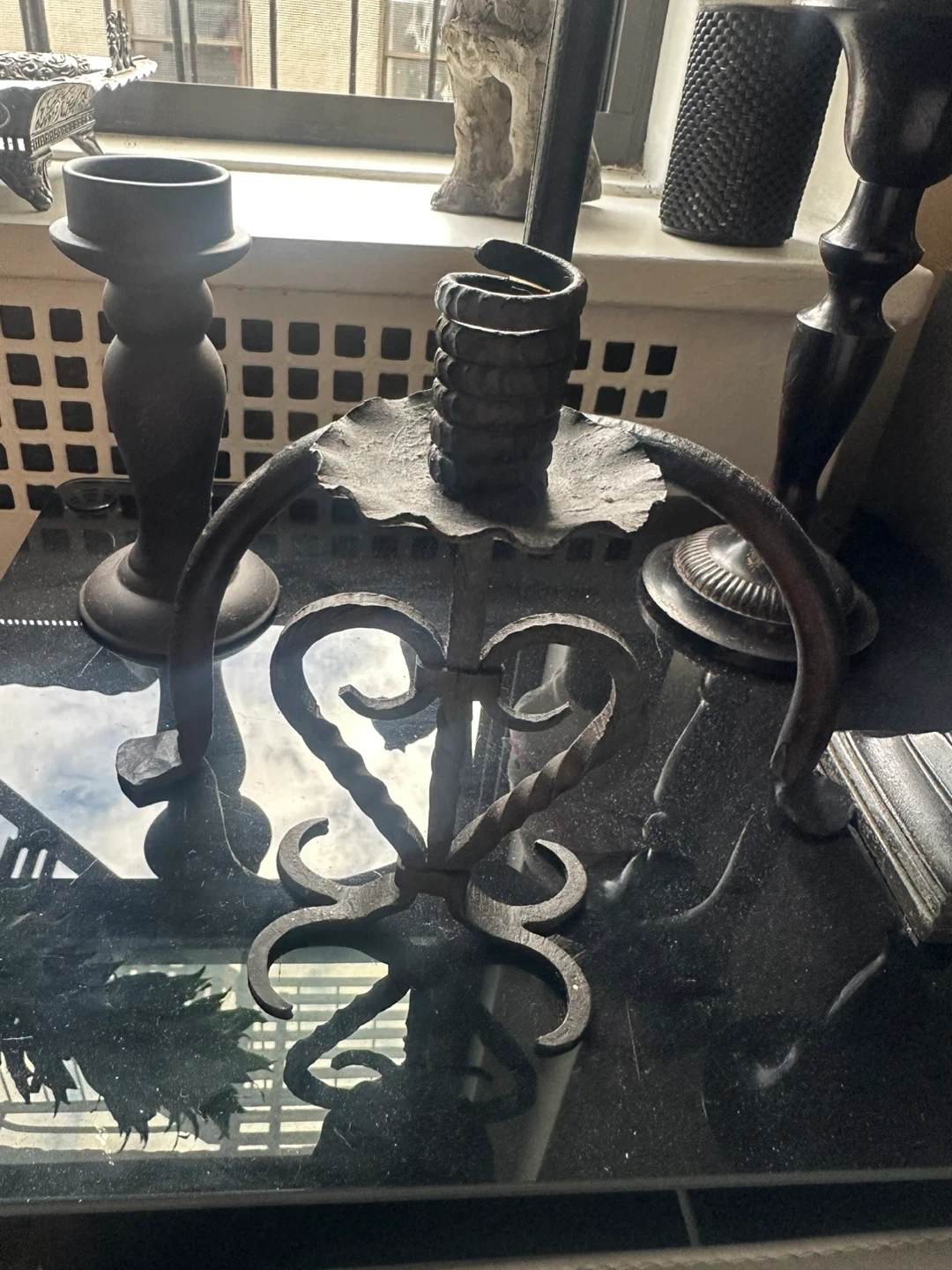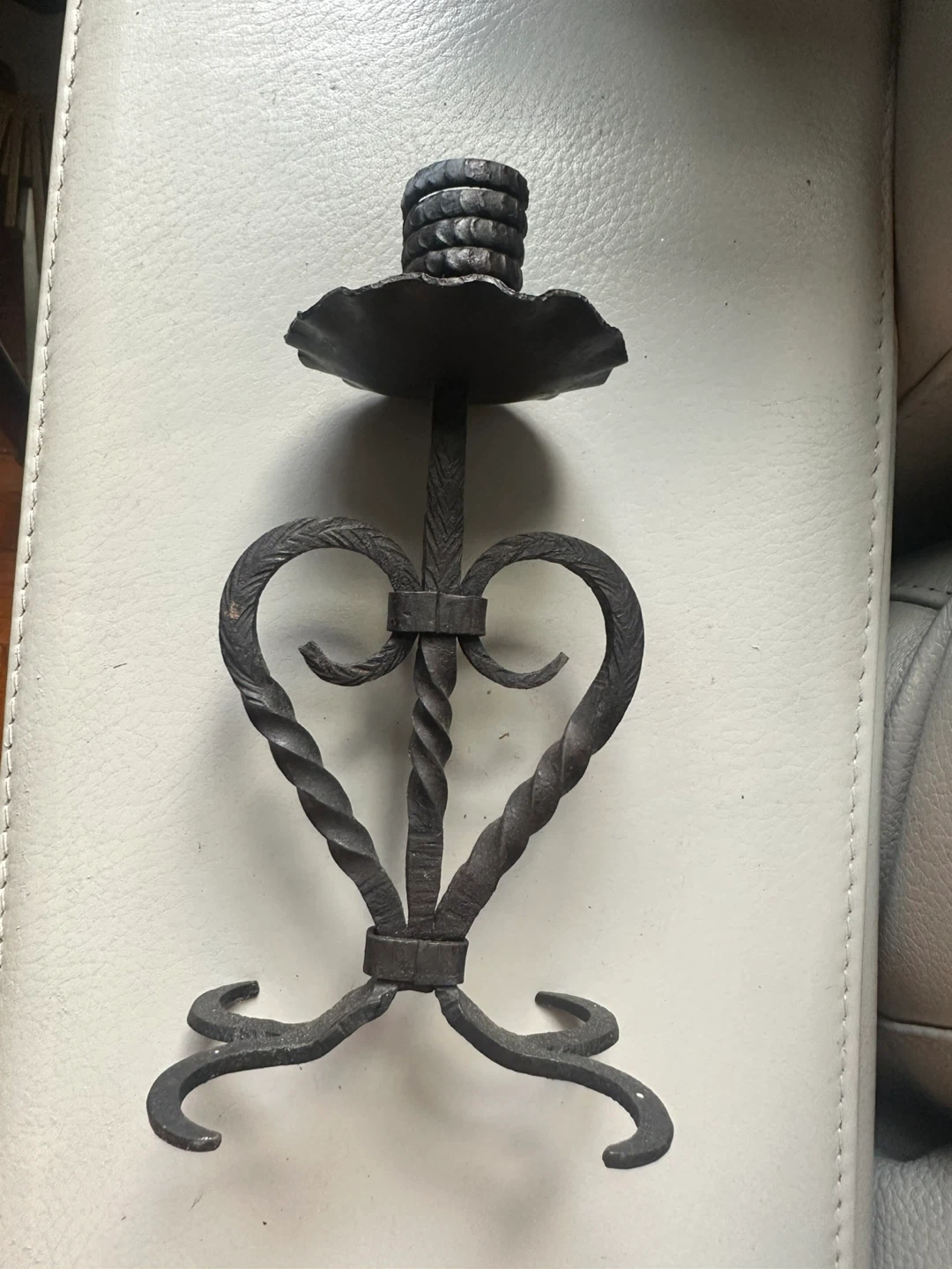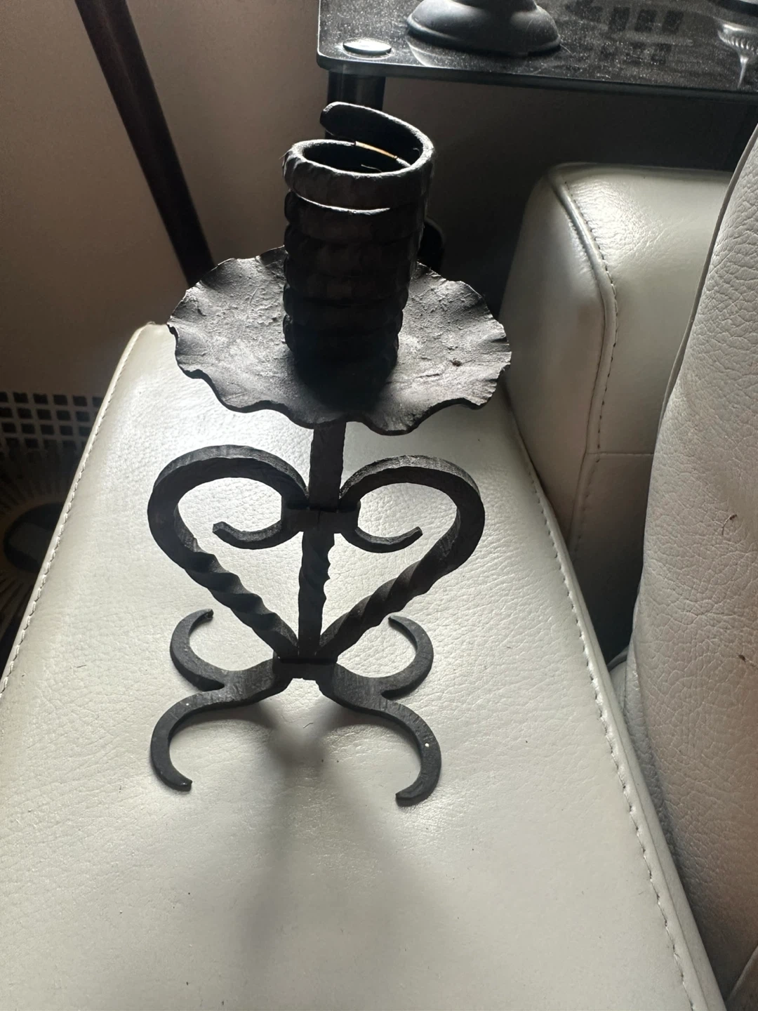 I'm selling a wrought iron candle holder. It has a unique, rustic design that would look great in any home. It's in good condition and ready for a new home!