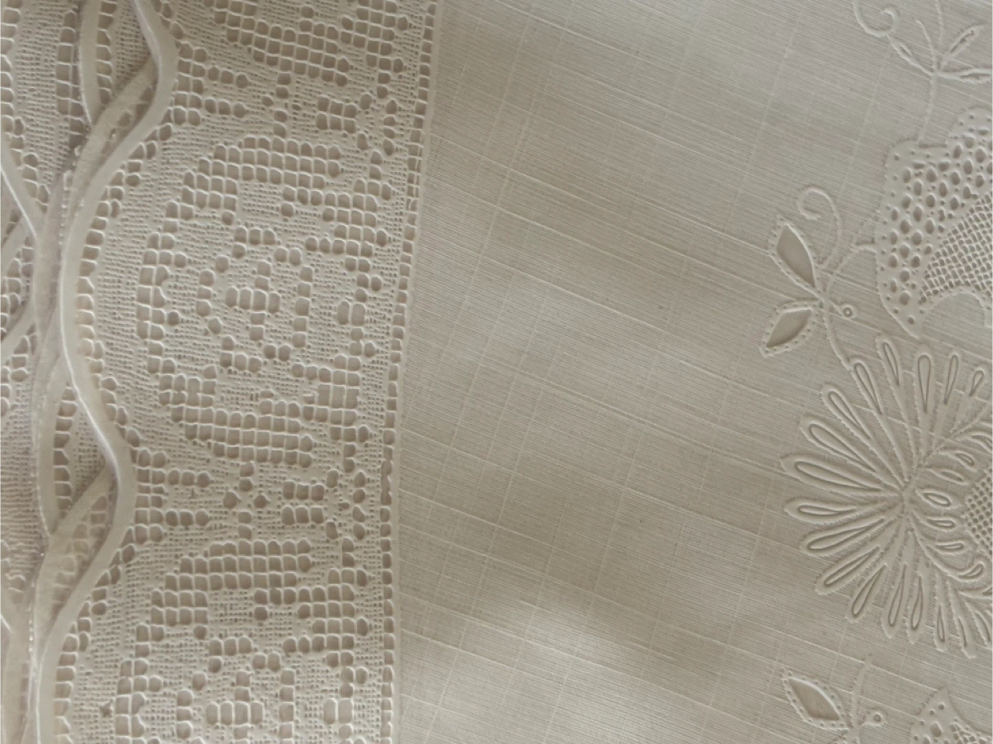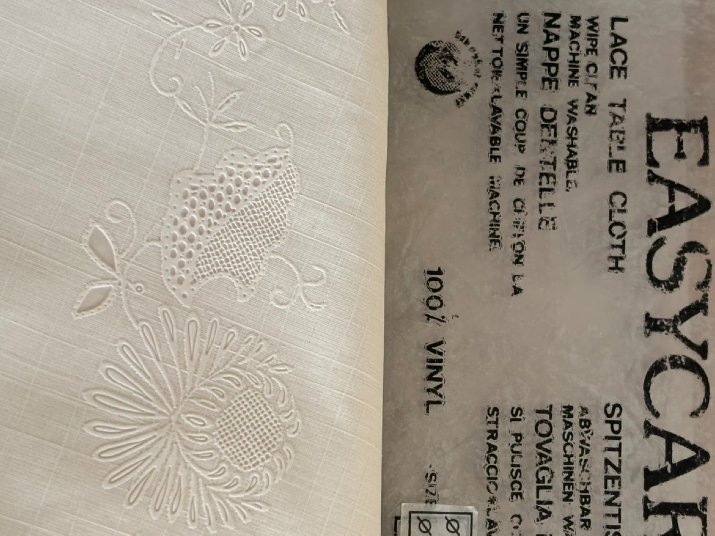 Extremely Soft Easycare lace table cloth! It's a 72" round, perfect for adding a touch of elegance to your dining space. Made of 100% vinyl, it's wipe clean and machine washable for easy care