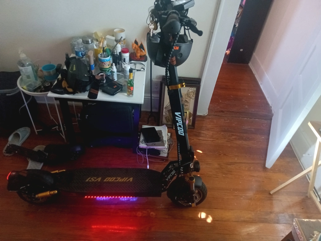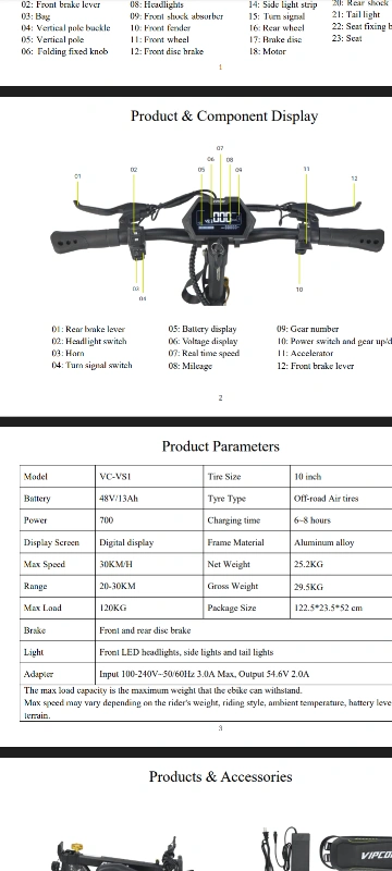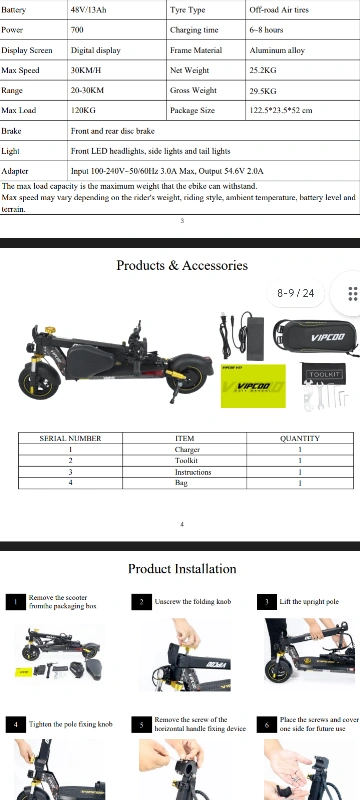 60This is a VIPCOO foldable electric scooter, perfect for teens and adults. It has a digital display, front and rear disc brakes, and LED headlights, sidelights, and taillights. The scooter has a 48V/13Ah battery and a range of 20-30KM. It also comes with a charger, toolkit, instructions, and a bag.