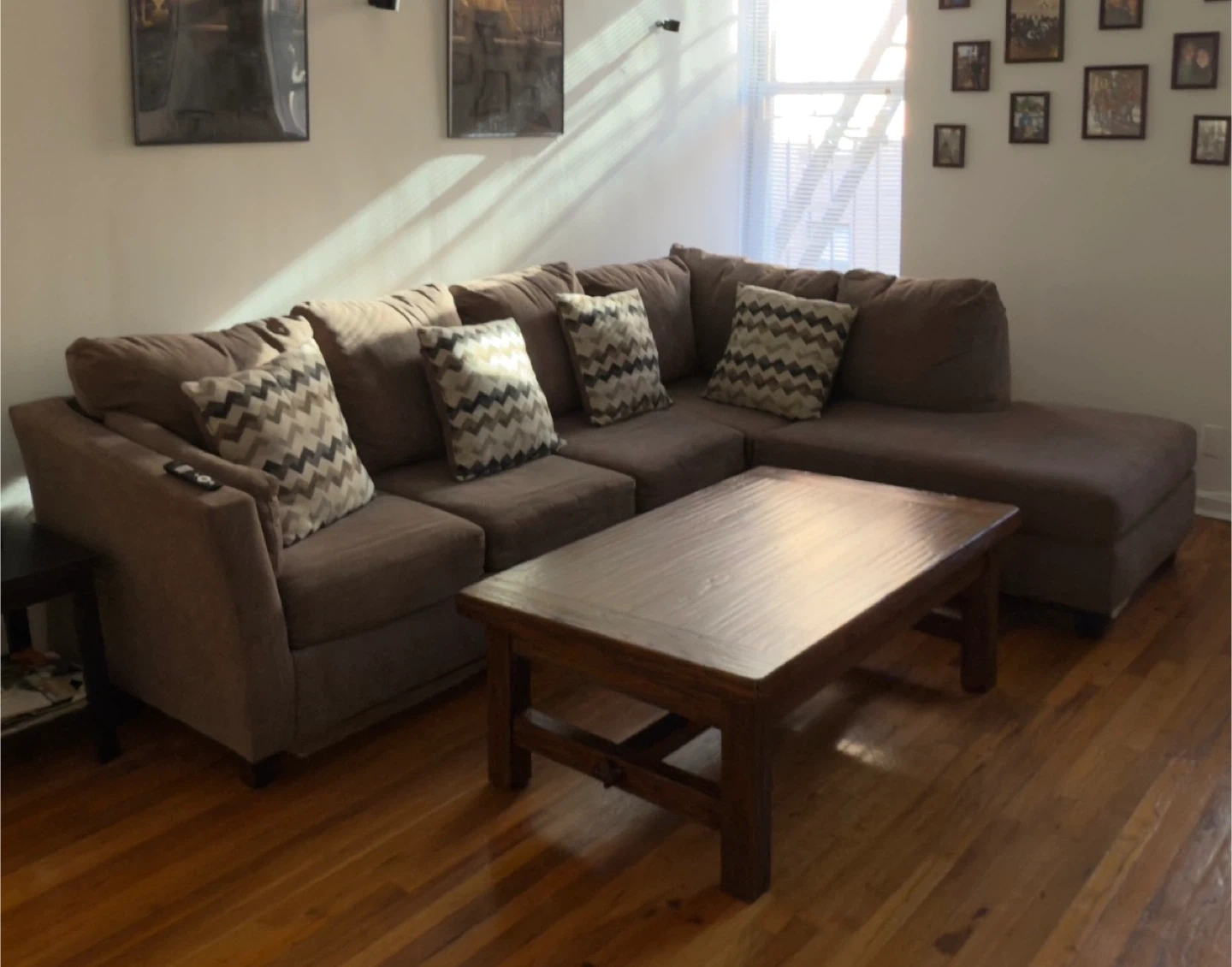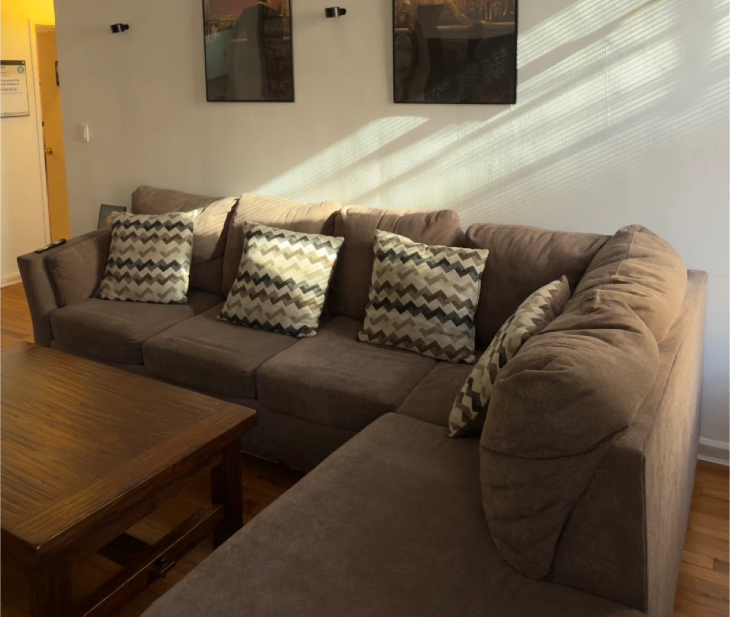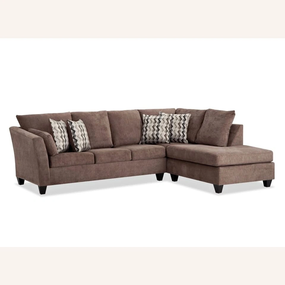 10This is a sectional sofa made from memory foam with a jersey knit fabric and in the color brown. Original Price: $1,000 Weight: 300lbs Overall Dimensions: 119"W x 85"D x 38"H Left Arm Facing Sofa: 82''W x 36''D x 38''H Right Arm Facing Chaise: 85''W x 37''D x 38''H Pickup Location: Extra Space Storage (7 Arden Avenue, Staten Island, NY 10312)