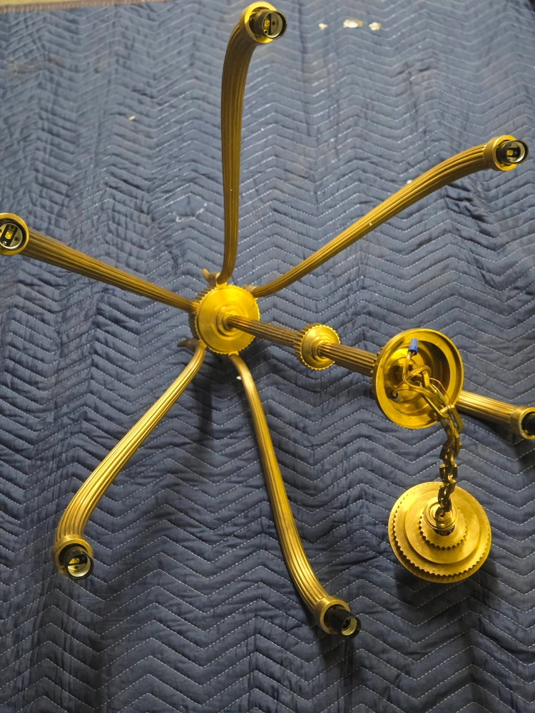 60Selling a gold-colored chandelier. It features multiple arms extending from a central hub, each ending in a socket for light bulbs. The design has a vintage or classic aesthetic, perfect for adding a touch of elegance to any room. visual comfort chandelier