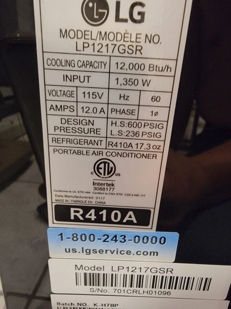 Selling an LG portable air conditioner, model LP1217GSR. It has a cooling capacity of 12,000 BTU/h and requires 115V power. It uses R410A refrigerant.