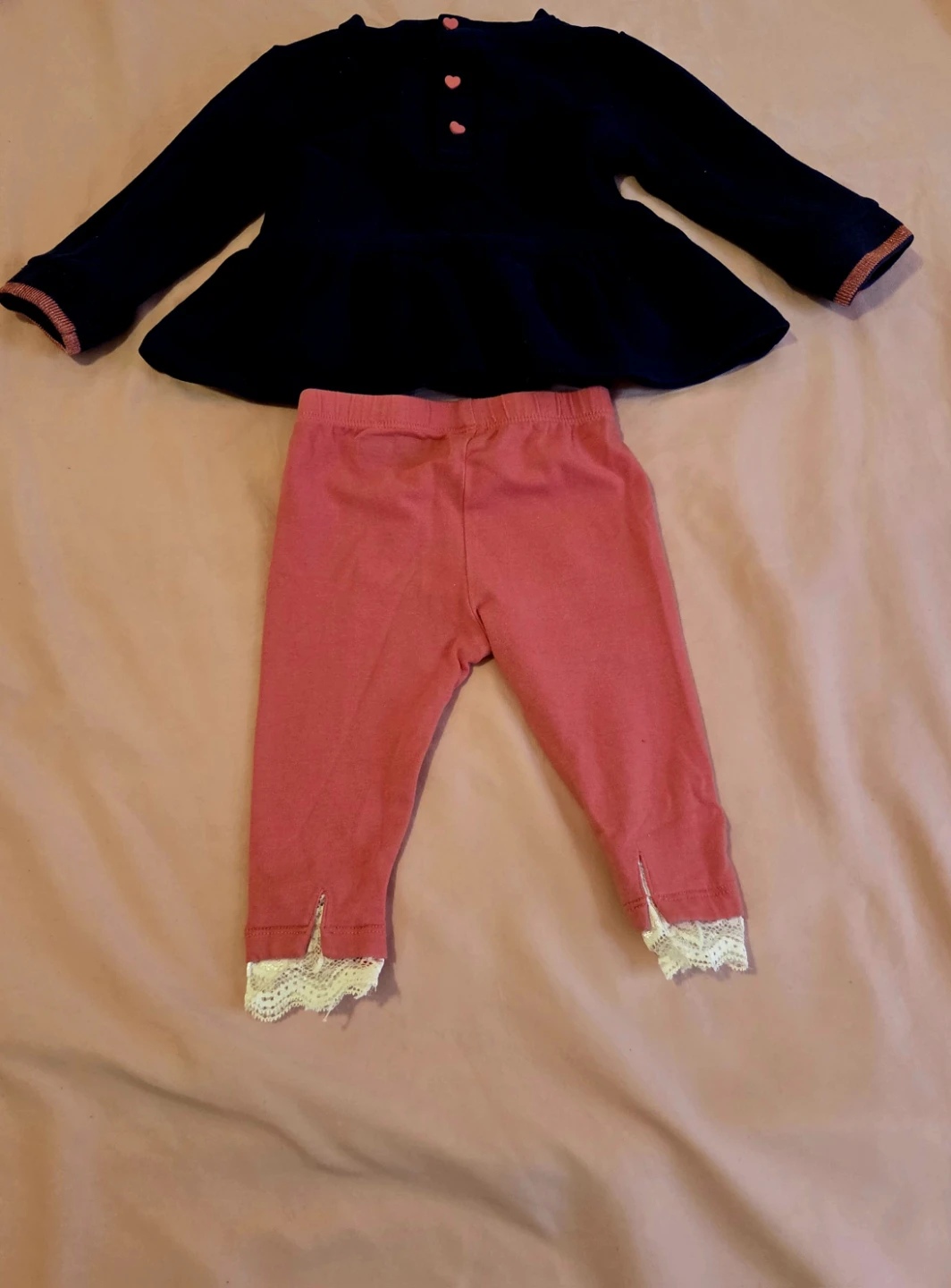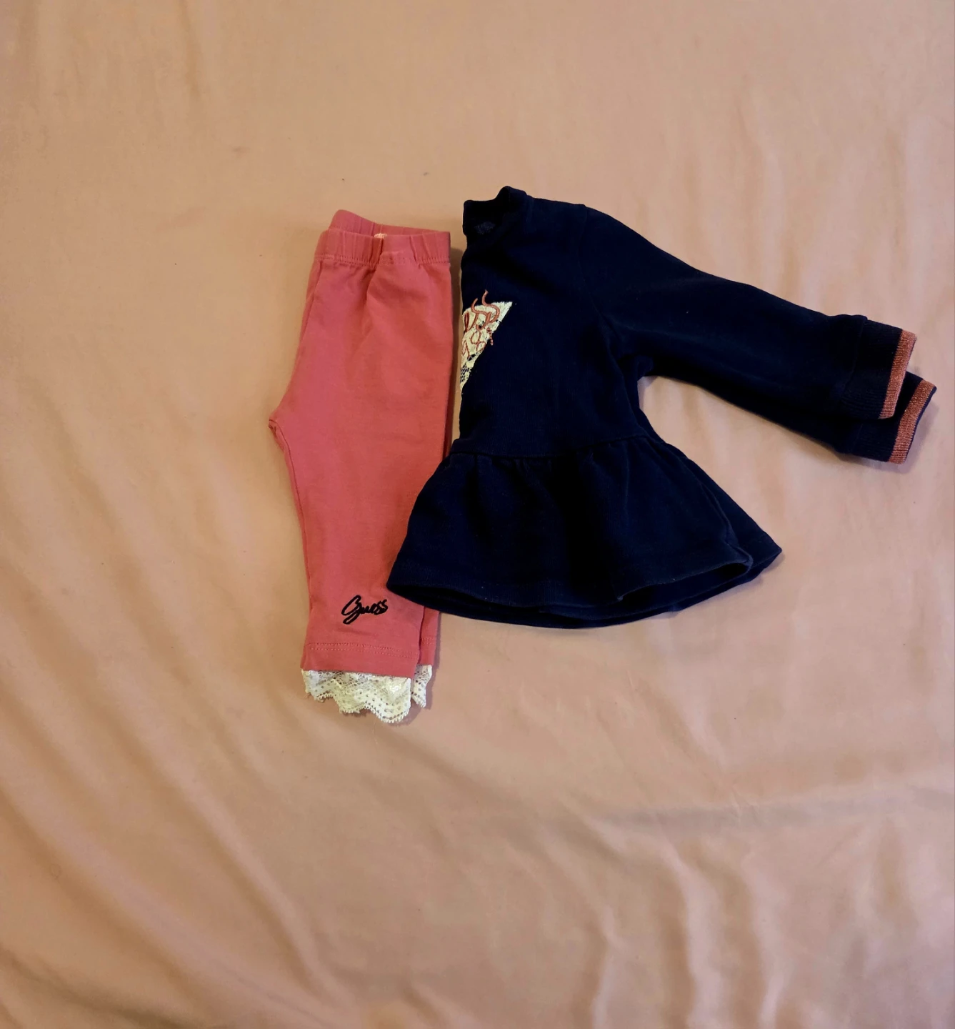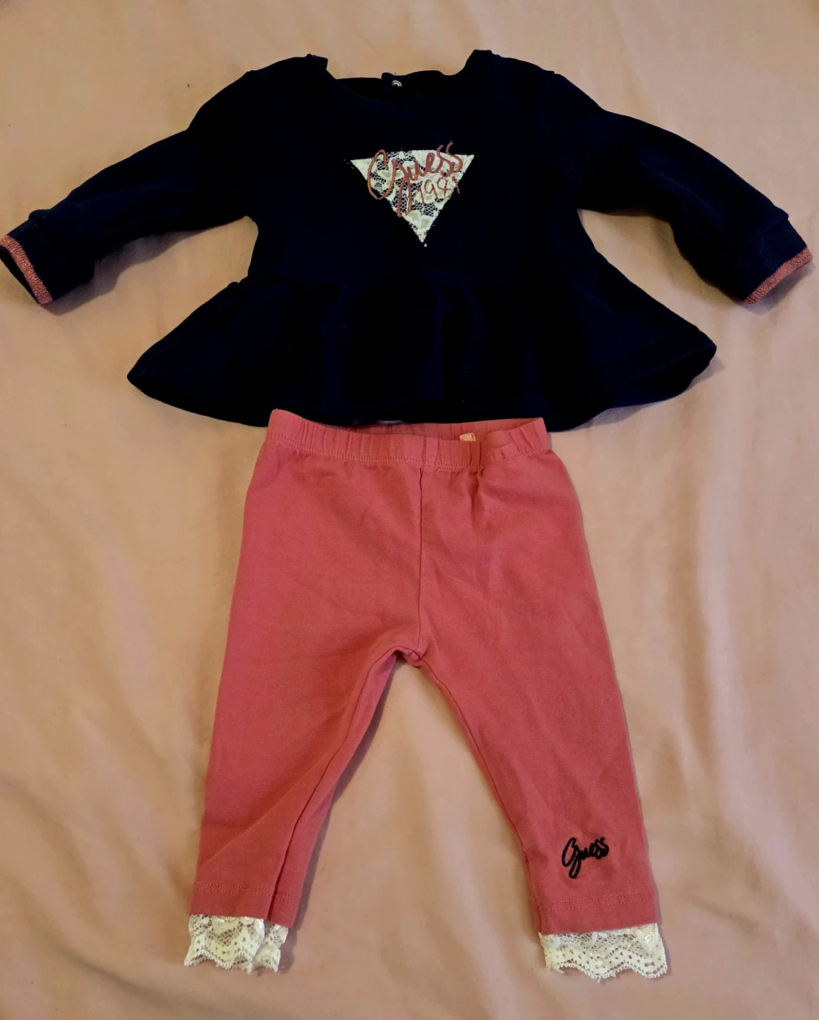 This cute Guess outfit includes a navy long-sleeve peplum top with a sparkly triangle logo and coordinating pink leggings. The leggings have a white lace trim at the ankles. It's a sweet set for your little one!