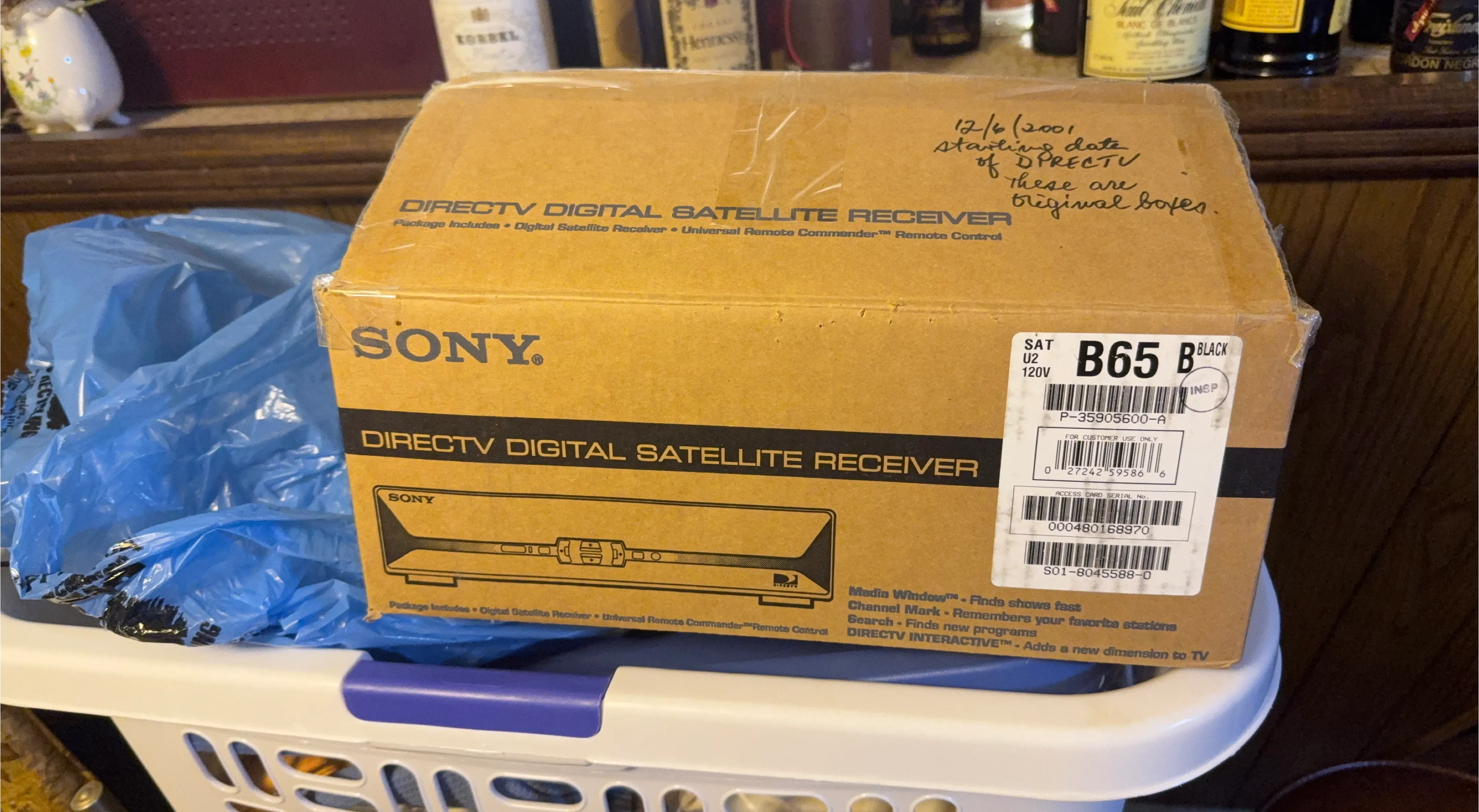 Sony DIRECTV digital satellite receiver, model B65. Package includes digital satellite receiver and universal remote commander. The starting date for DIRECTV was 12/6/2001. This is an original box.