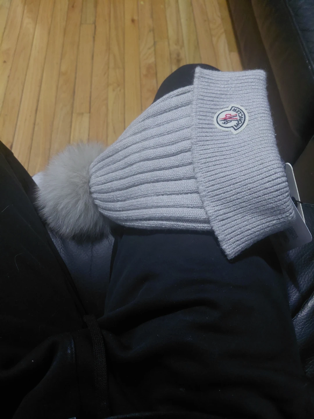 Light grey knit beanie with a faux fur pom pom. Features the signature Moncler logo patch. Made from a soft, ribbed material.