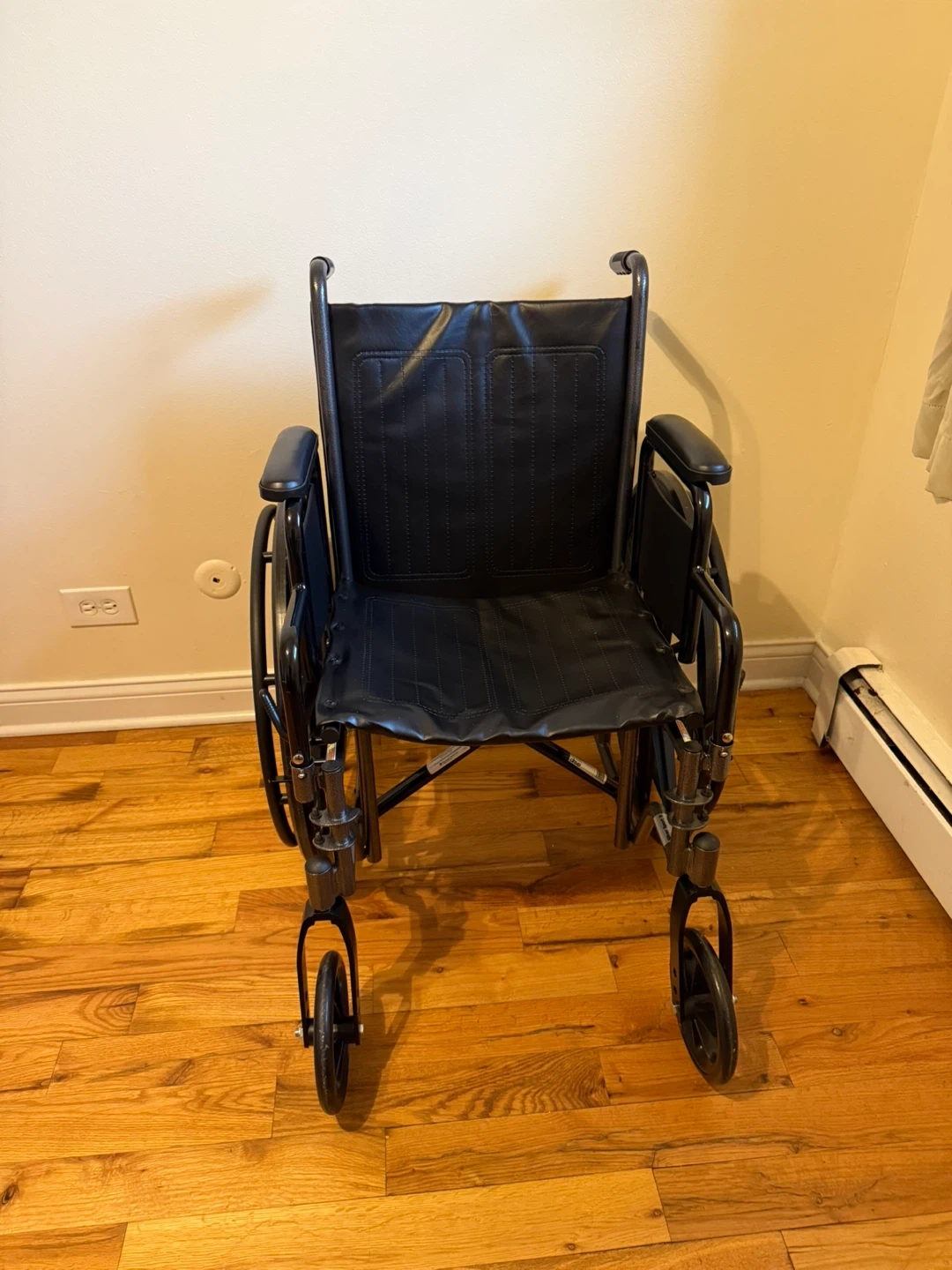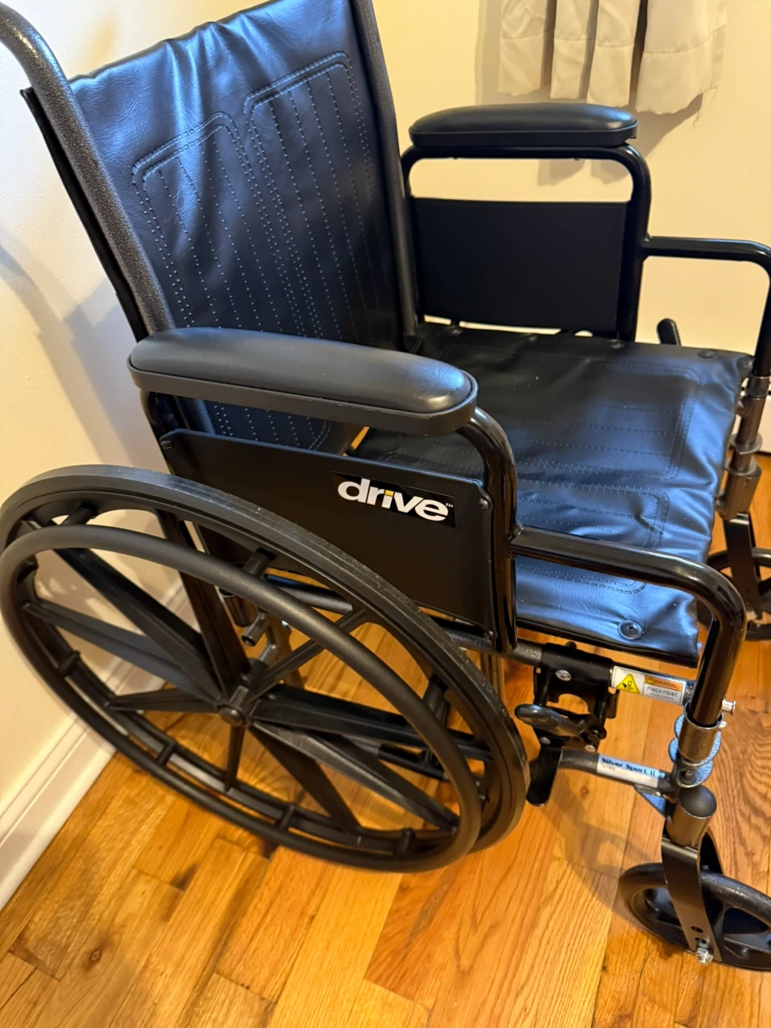 This black Drive Medical cruiser wheelchair is in good condition. It features padded armrests and a comfortable seat. It's foldable for easy transport and storage. This wheelchair is ideal for anyone needing mobility assistance. Porch pick up only