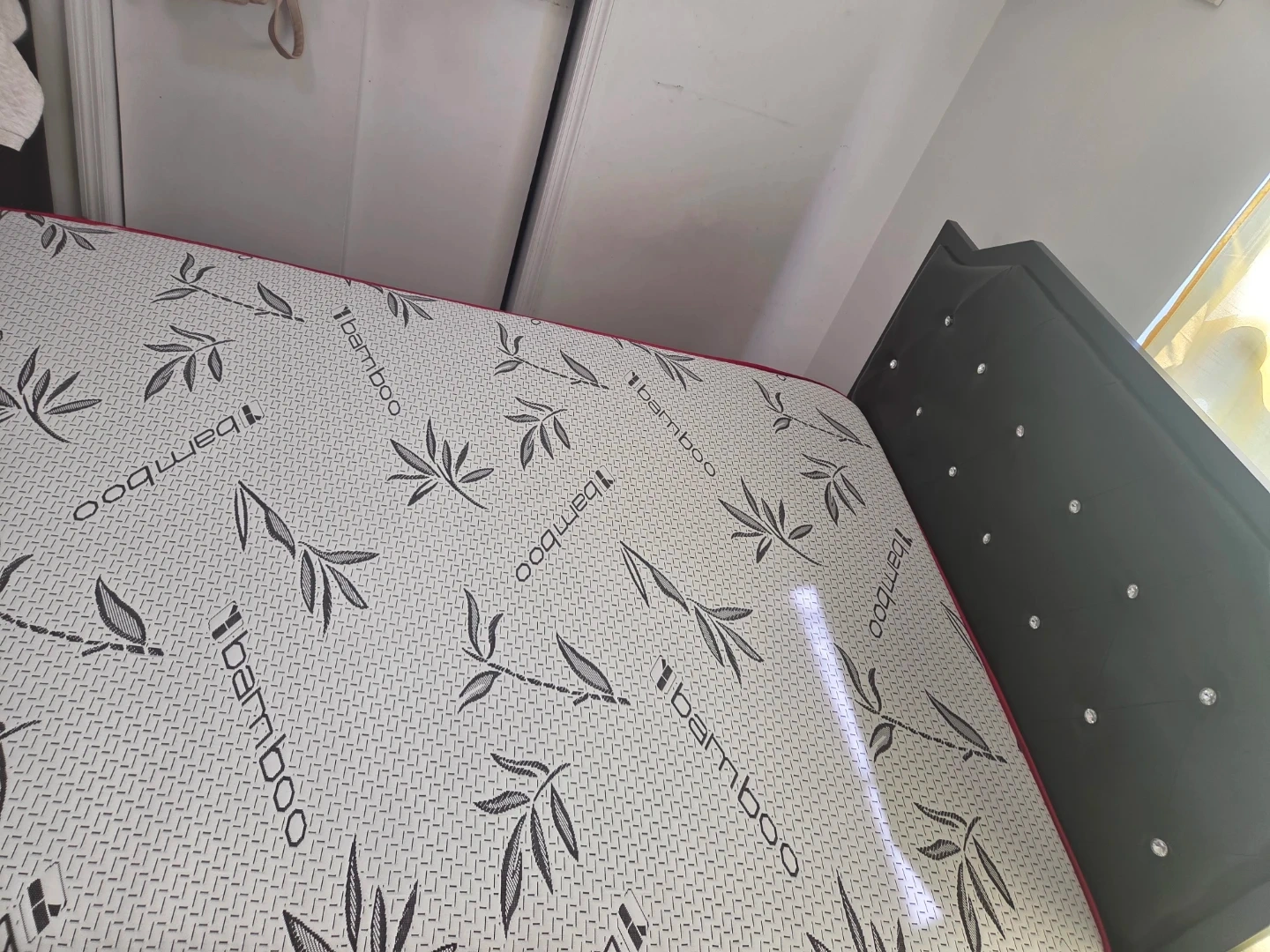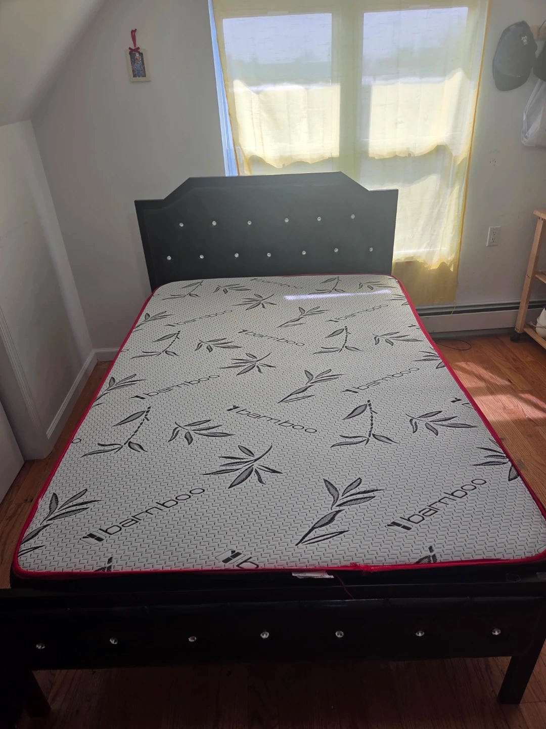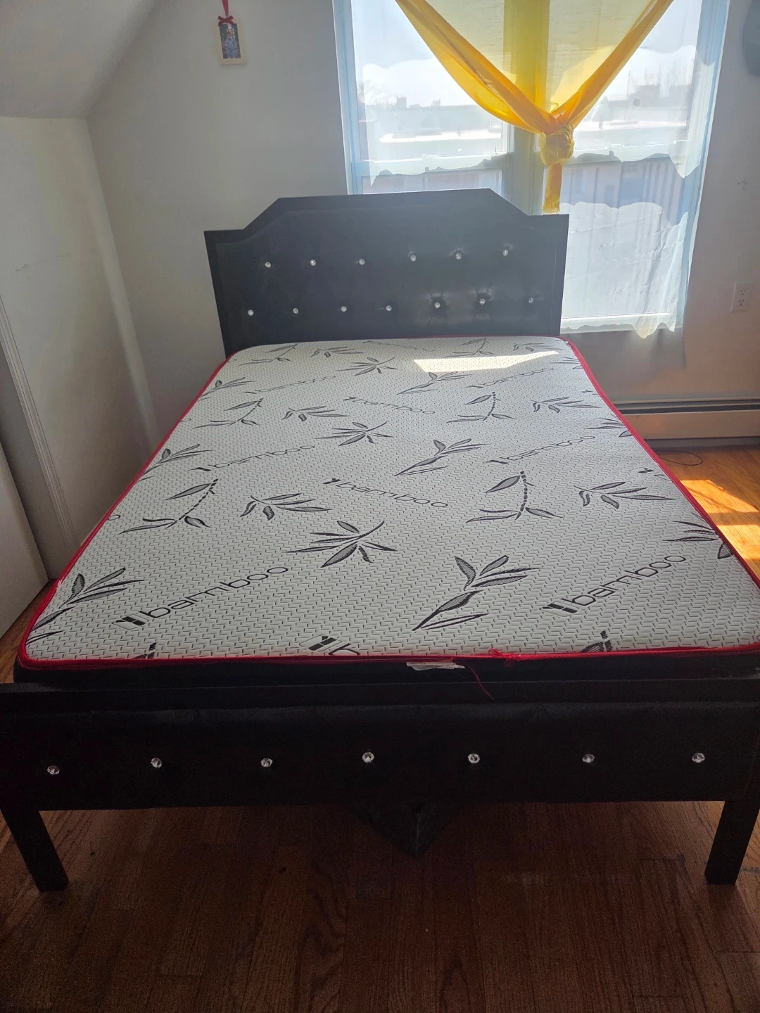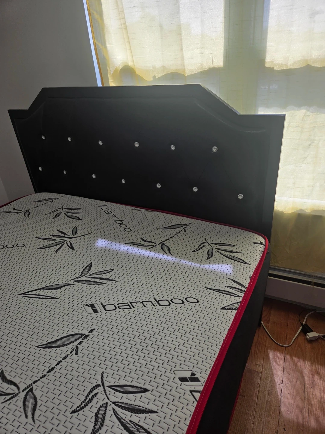 This is a queen-size bed frame in black with a diamond-tufted headboard. It includes a bamboo-patterned mattress. The frame's upholstery appears to be velvet.