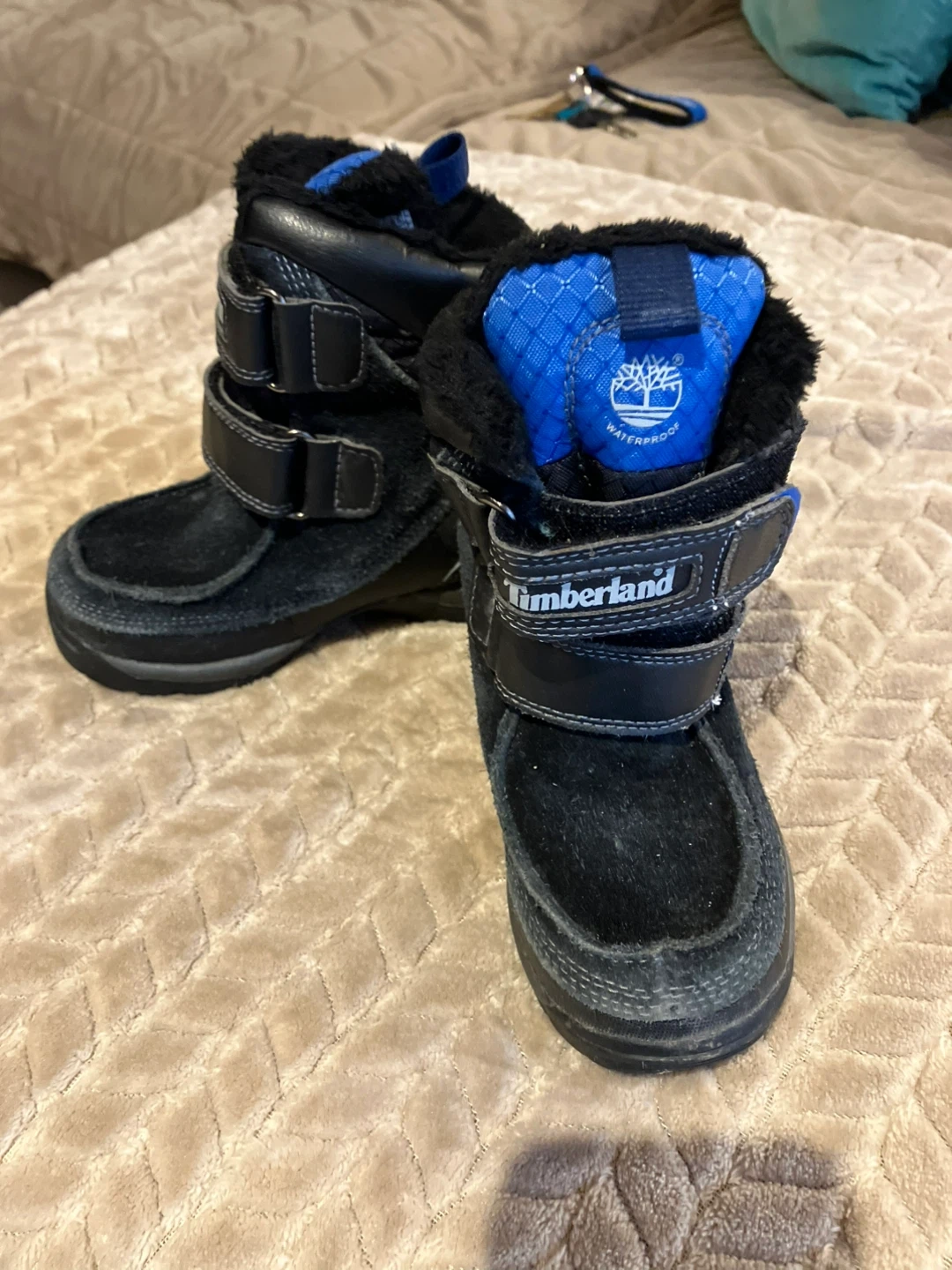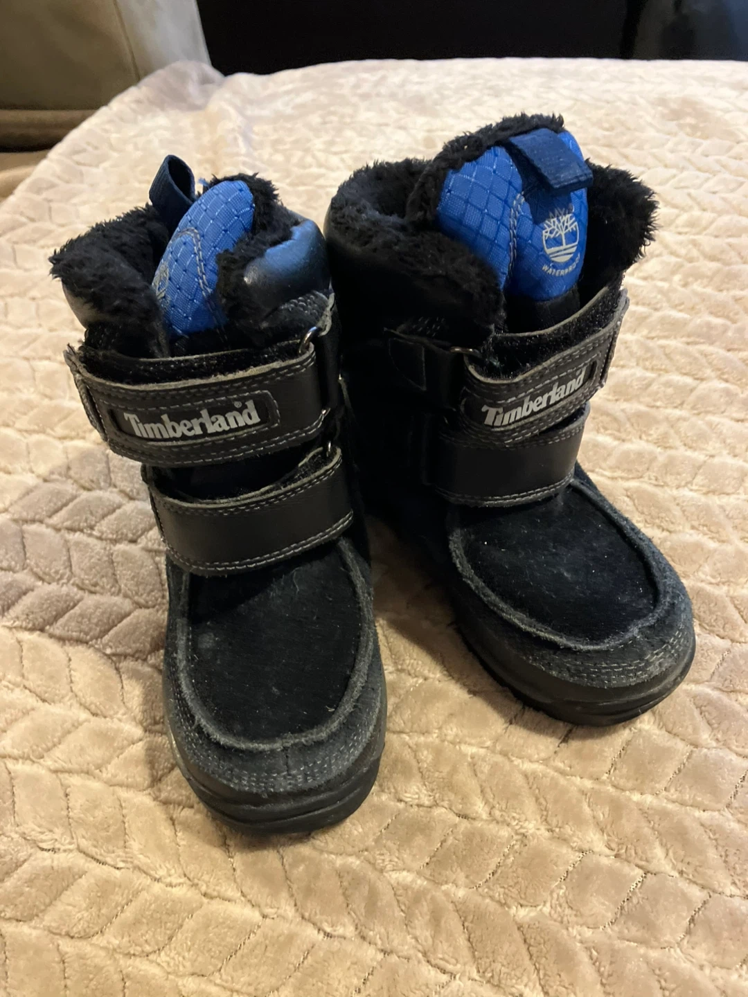 These are a pair of Timberland winter boots in black. They are a US size 8.5. They're perfect for keeping your feet warm and dry during the cold weather! Cash and pick up only!