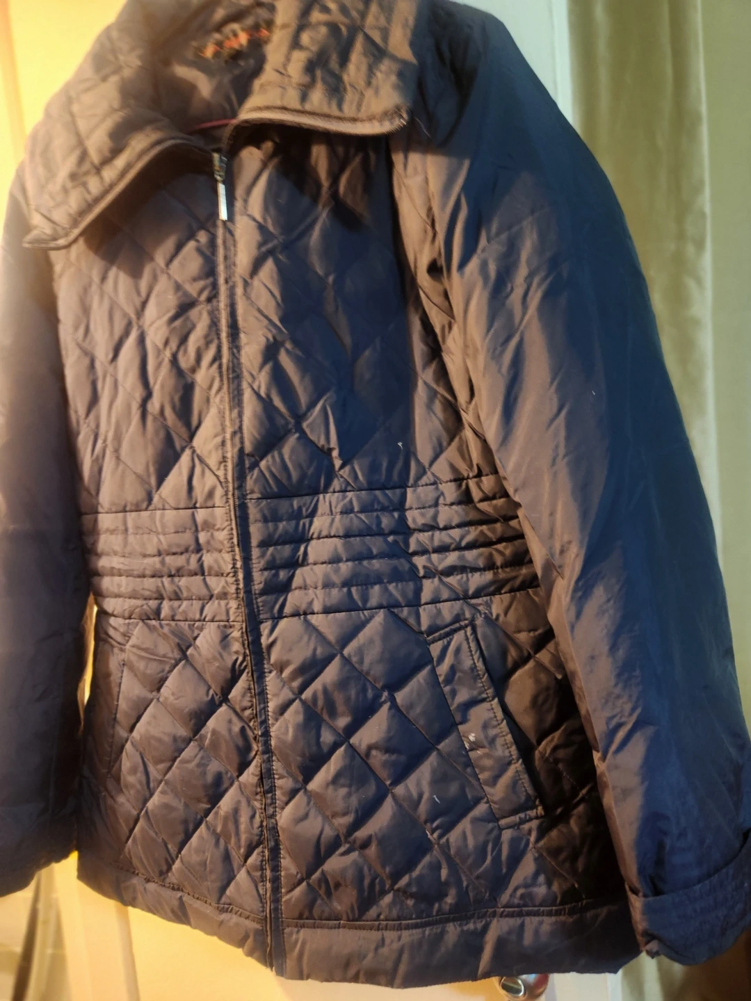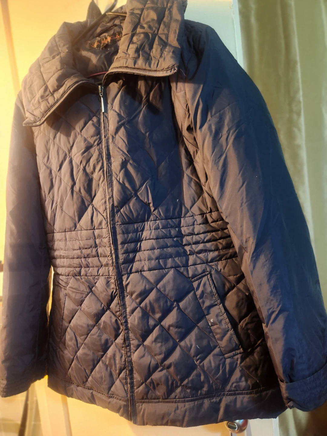 Quilted navy jacket by Via Spiga. Full zip front with a stand-up collar. Size L.
