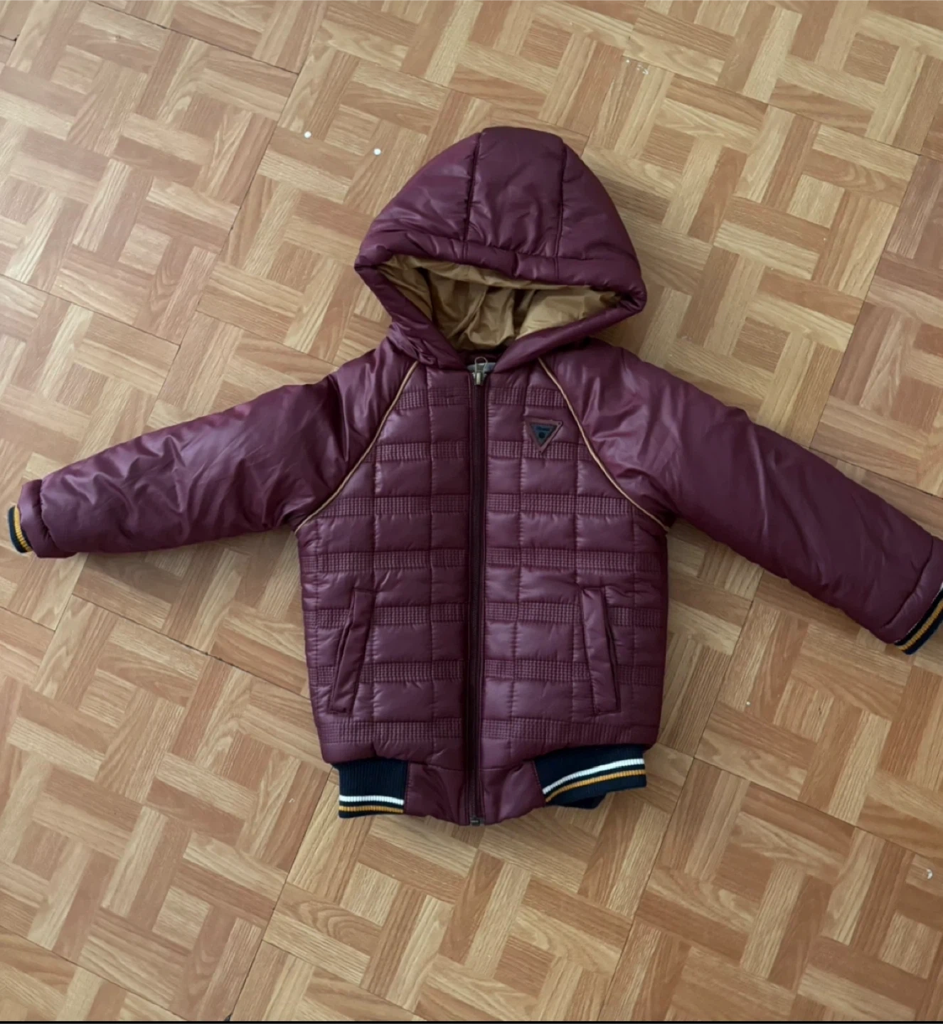 Here's a gently used kids puffer jacket in a nice burgundy color! It has a hood and a quilted design. Perfect for keeping your little one warm and stylish.
