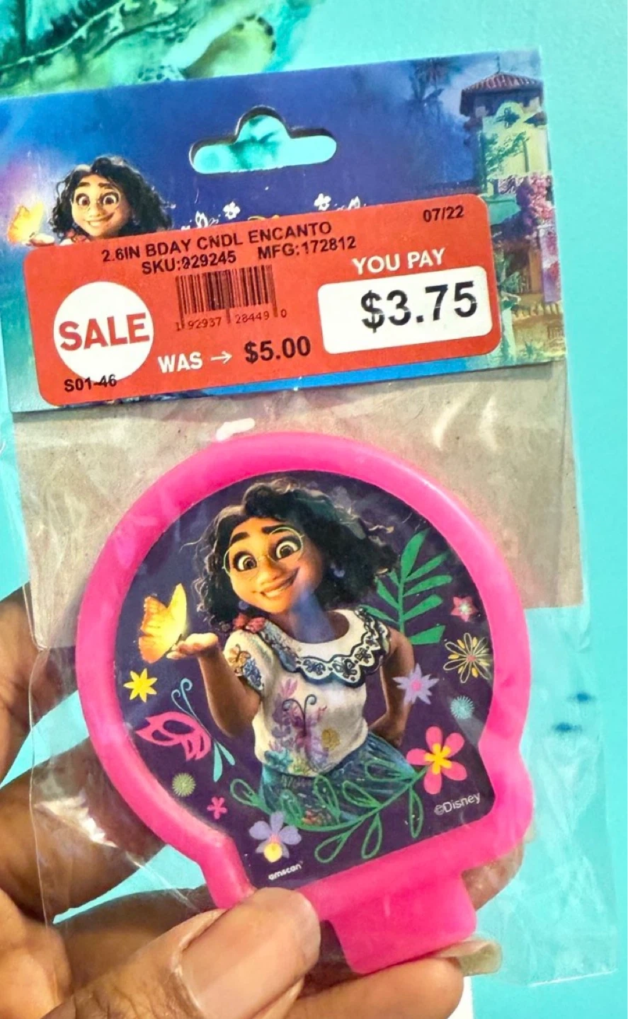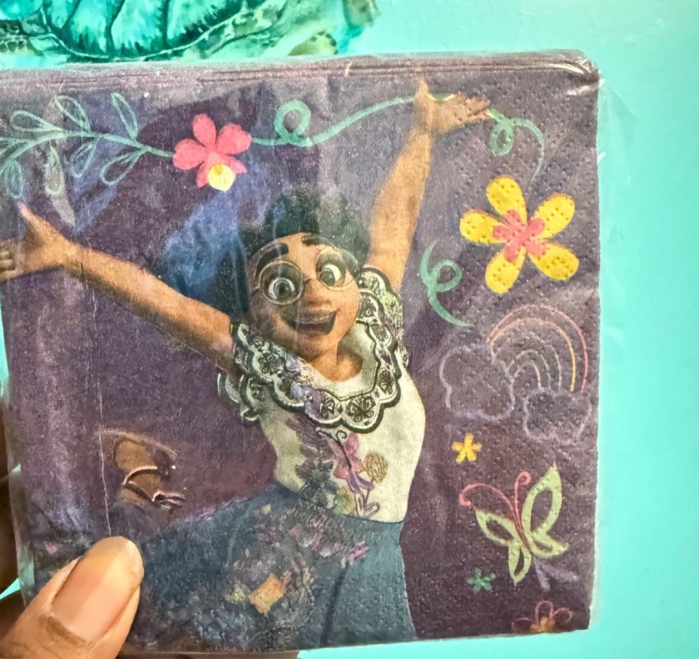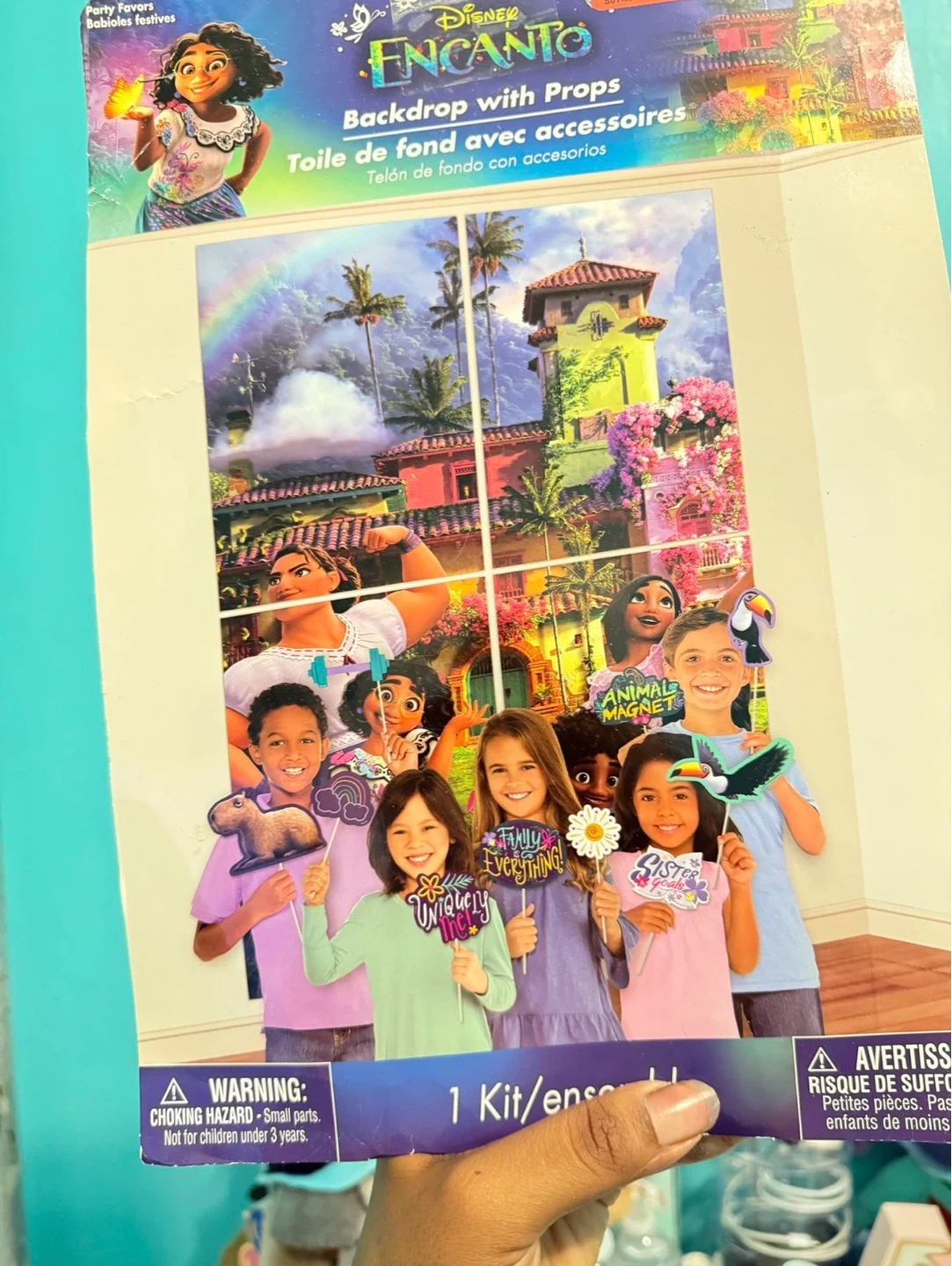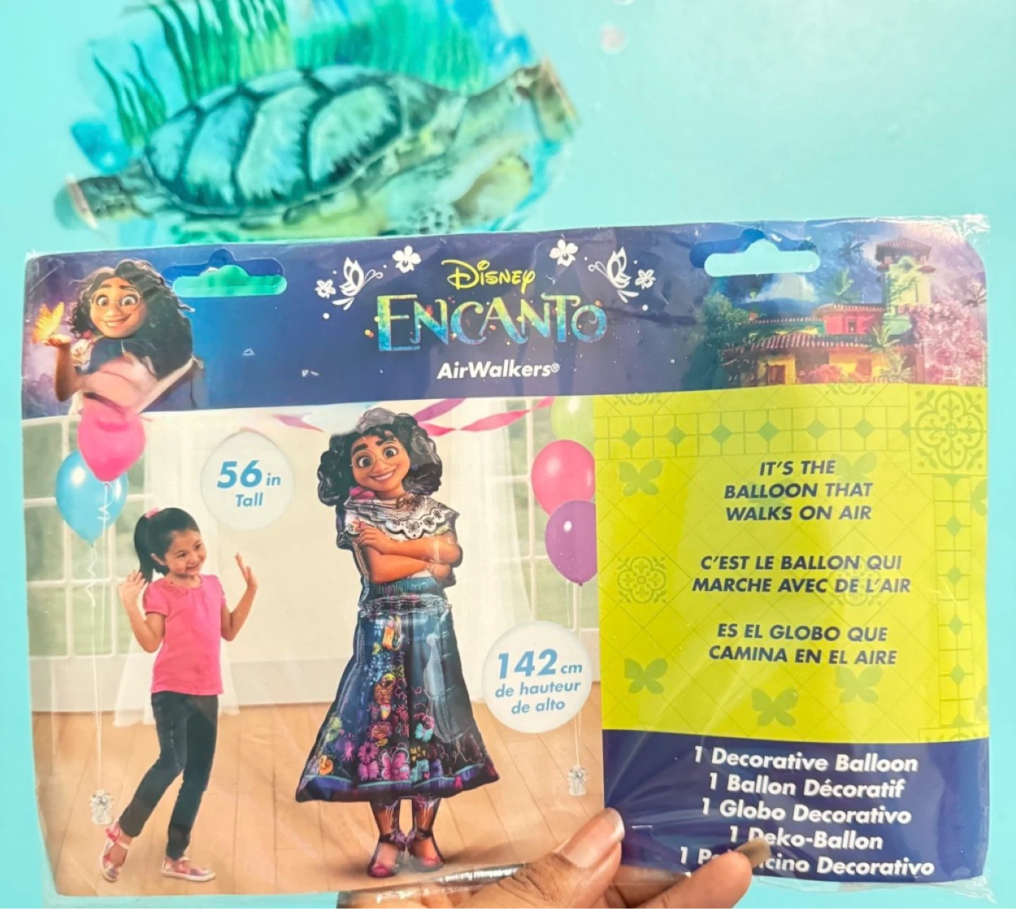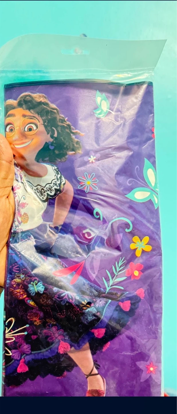 Disney Encanto party kit with a backdrop and props. Includes a 56-inch tall AirWalker balloon and a 2.6-inch Encanto cake candle. Also includes Encanto themed napkins. Perfect for birthday celebrations!