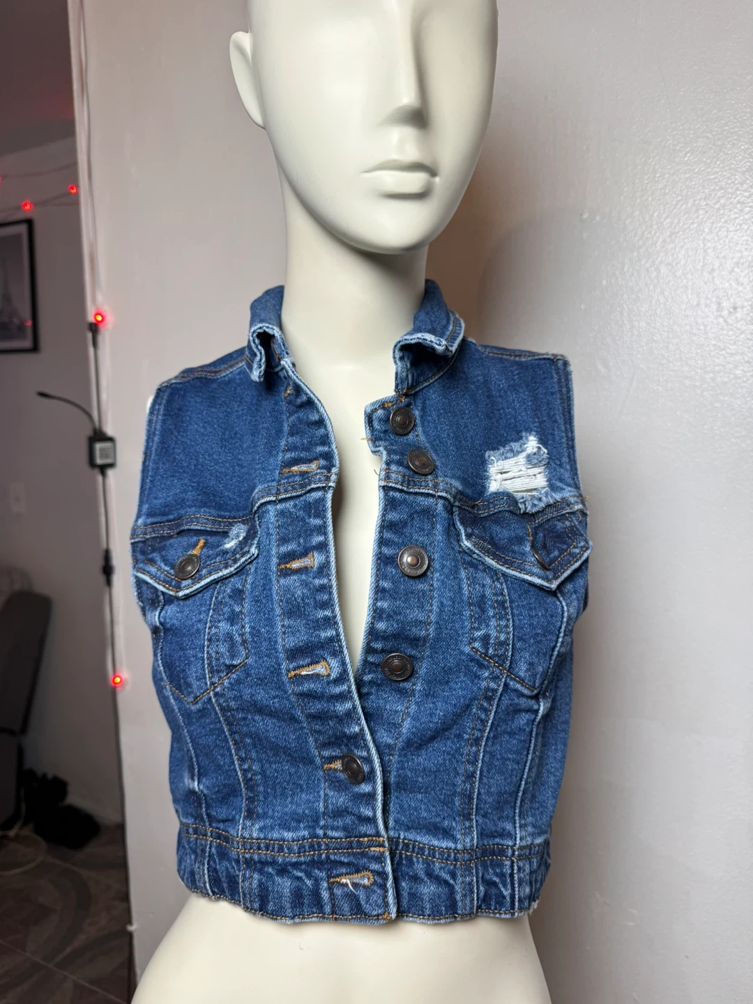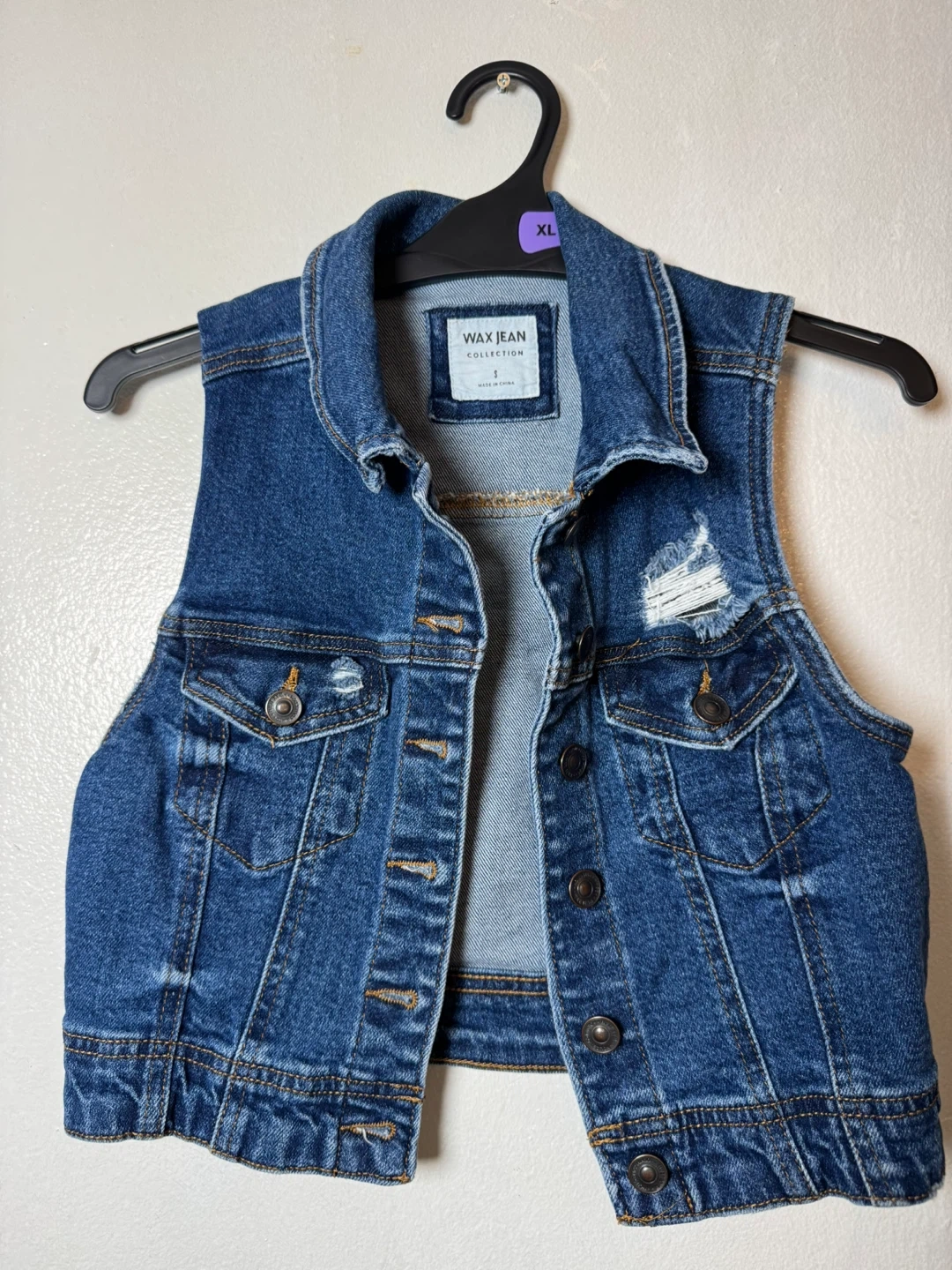 This is a blue denim vest from Wax Jean Collection. It's a size small with distressed detailing on the pockets and chest. It buttons down the front.