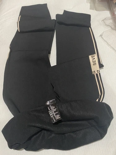 Black leggings with a beige stripe on the left side. Made with 95% polyester and 5% elastane for comfortable stretch and abdomen control. One size fits most.