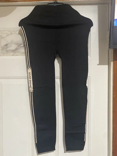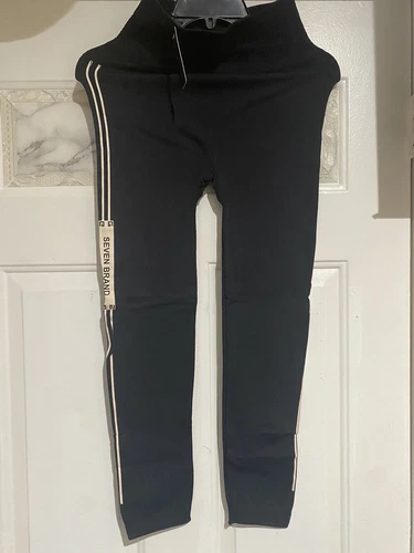 Black leggings with a beige stripe on the left side. Made with 95% polyester and 5% elastane for comfortable stretch and abdomen control. One size fits most.
