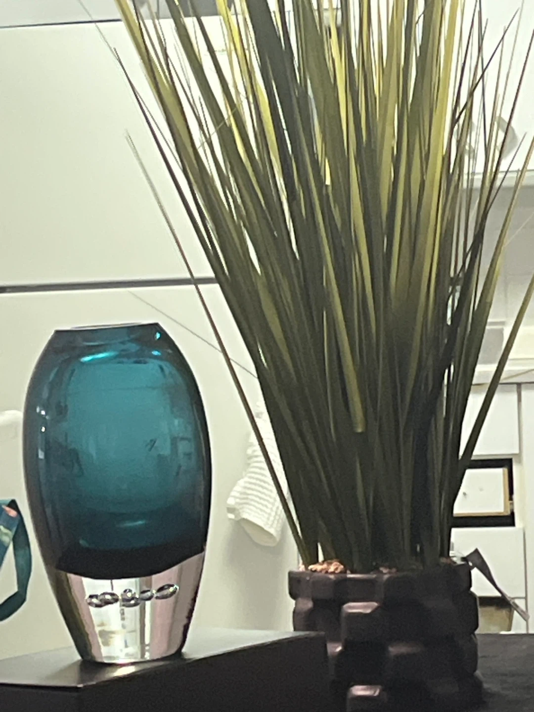 This teal blue glass vase has a unique bubble design at its base. It's a beautiful decorative piece for any room. Perfect for displaying fresh or artificial flowers!