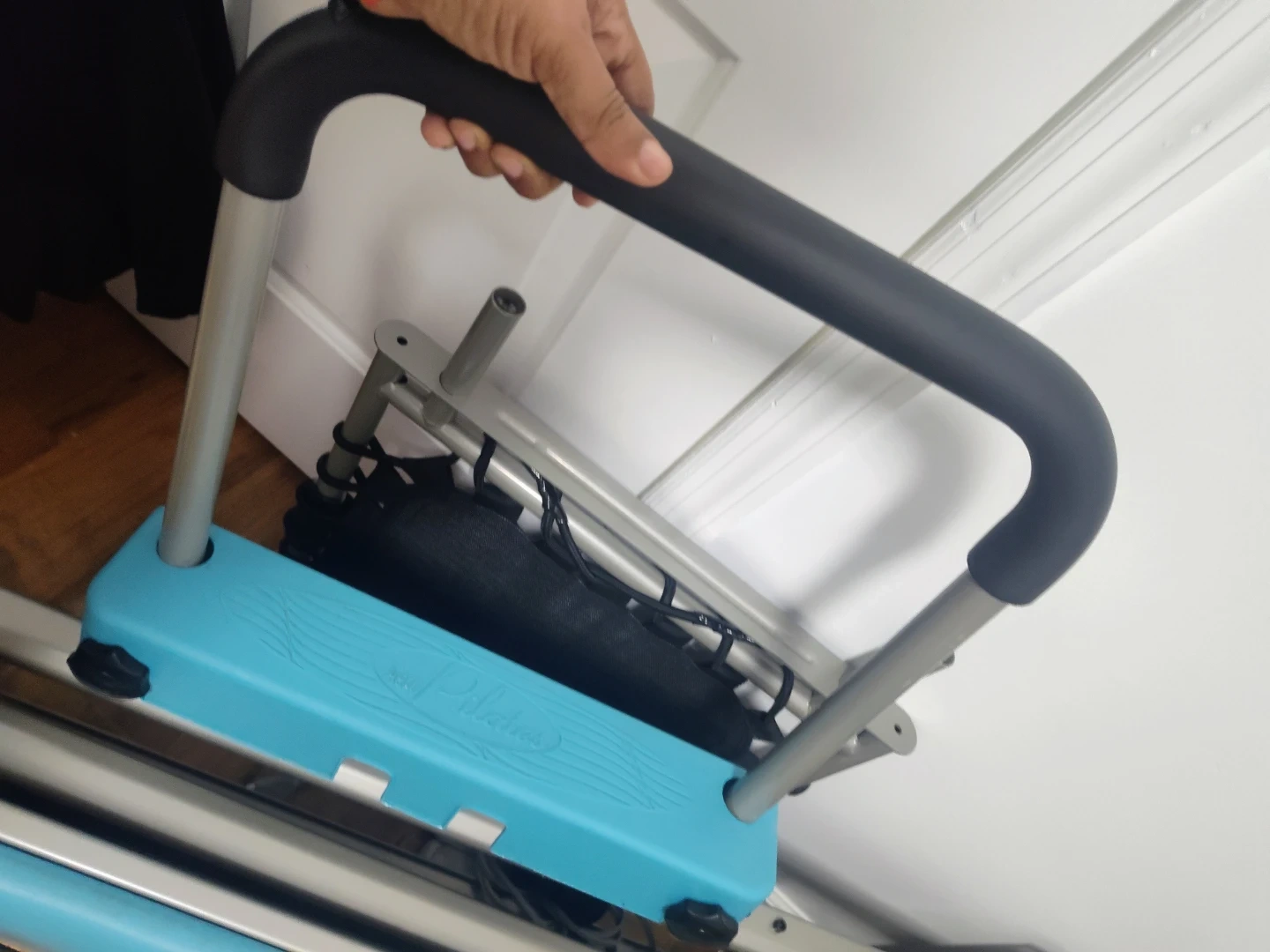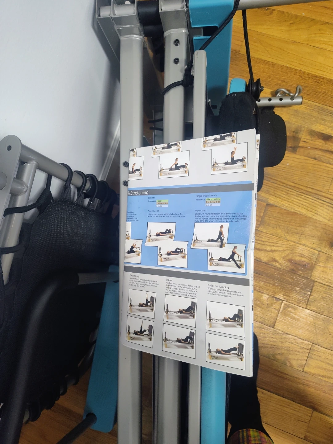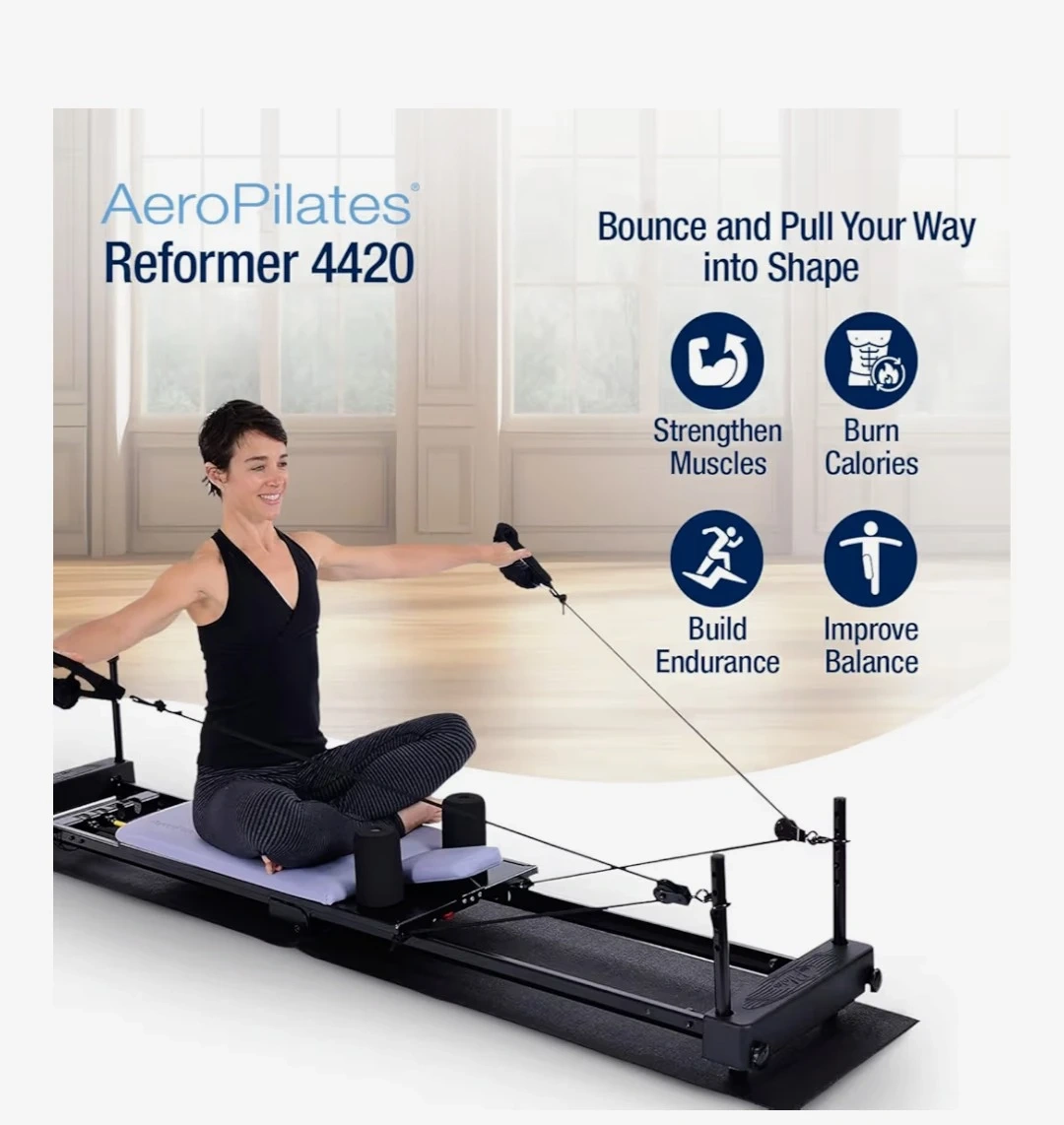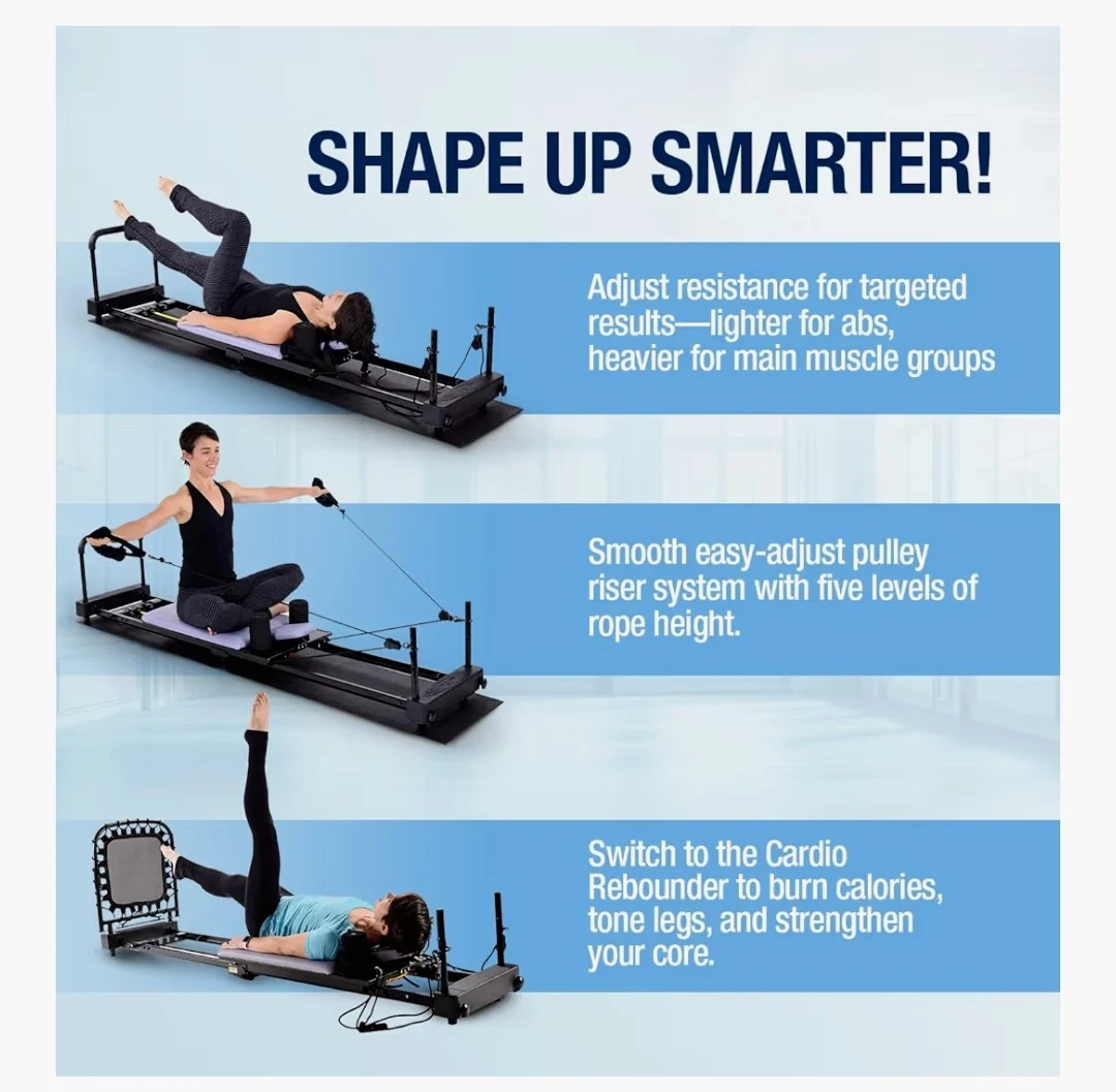 This AeroPilates Reformer 4420 Plus is a foldable workout machine. It includes a cardio rebounder. The machine features adjustable resistance and a smooth pulley riser system with four levels of rope height.***blue color***
