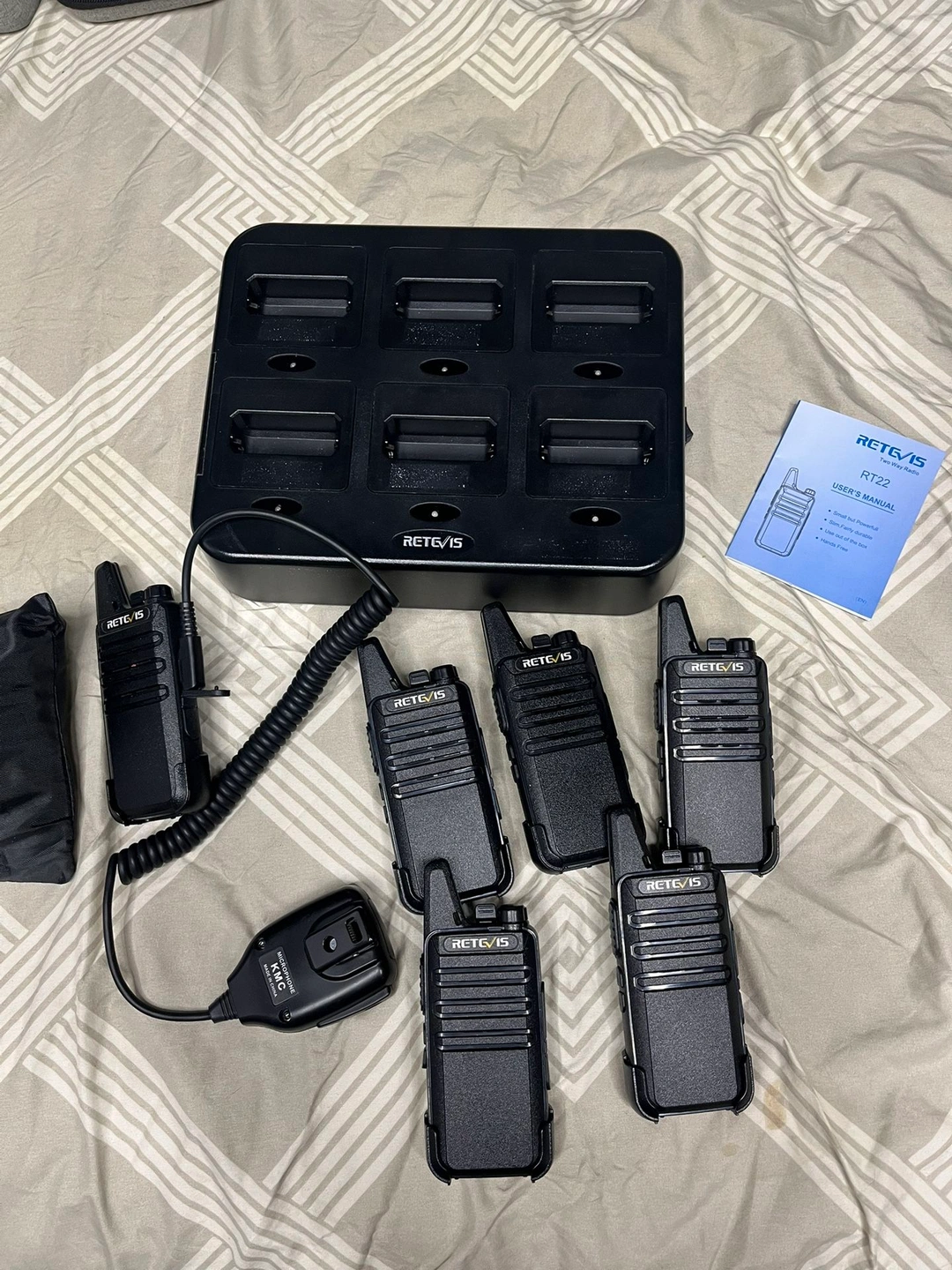 Six two-way radios with charger port and portable chargers. Open box with manual. One includes a microphone adapter. Model: RT22.