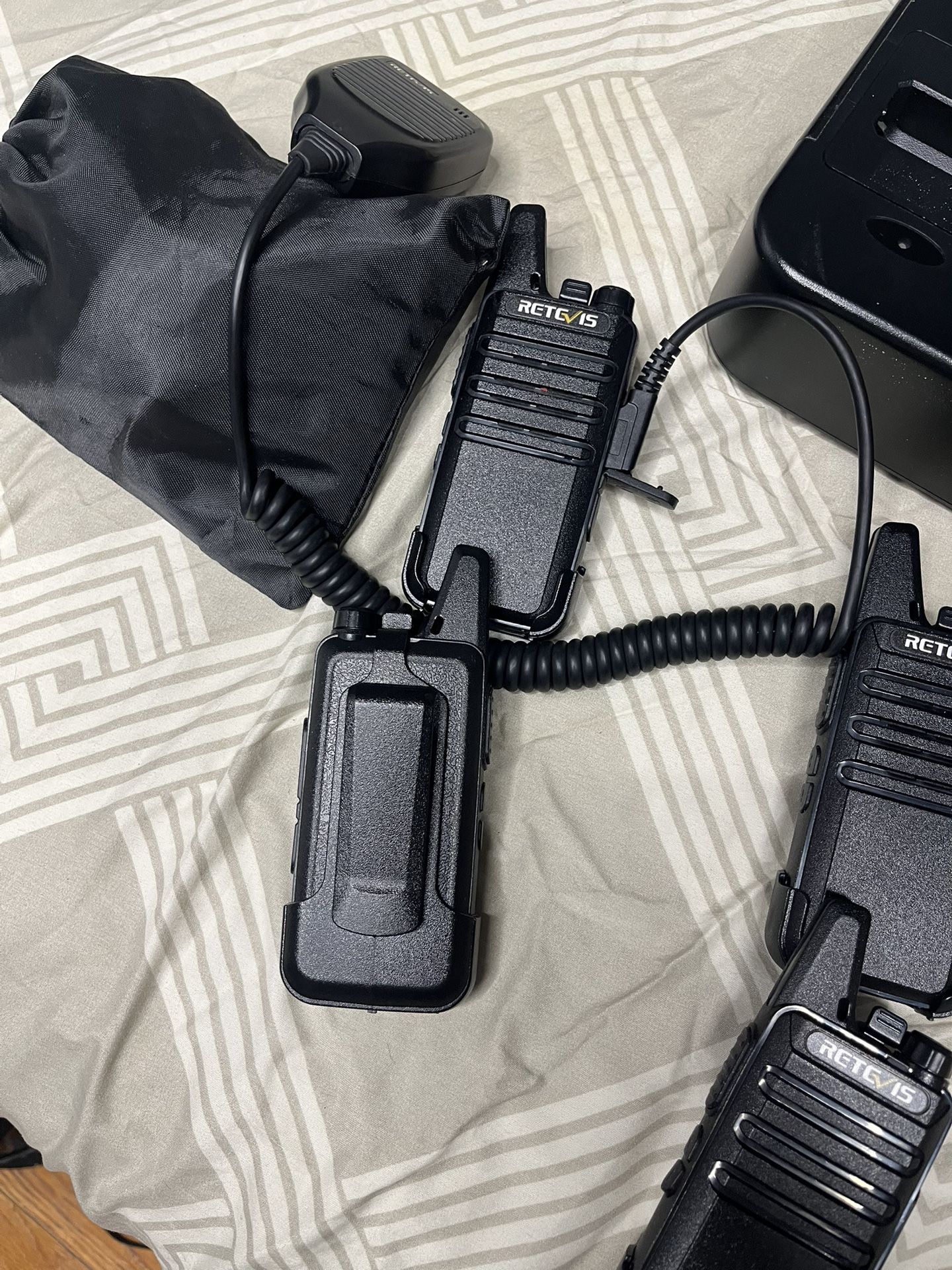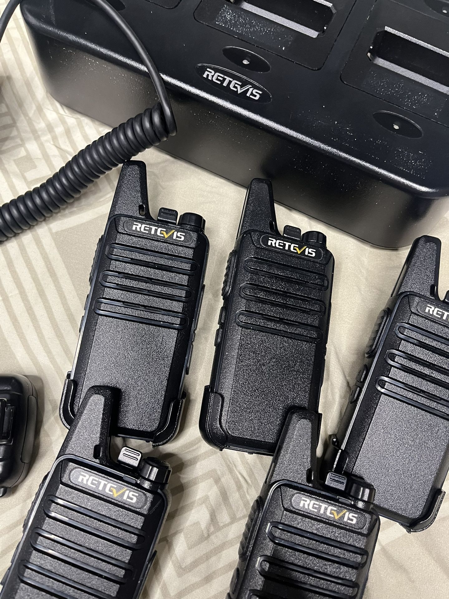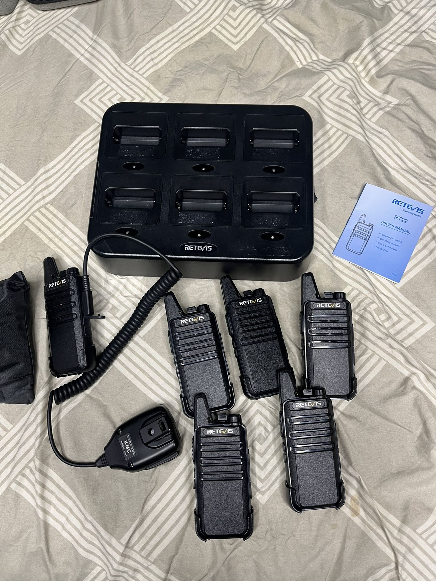 Six two-way radios with charger port and portable chargers. Open box with manual. One includes a microphone adapter. Model: RT22.