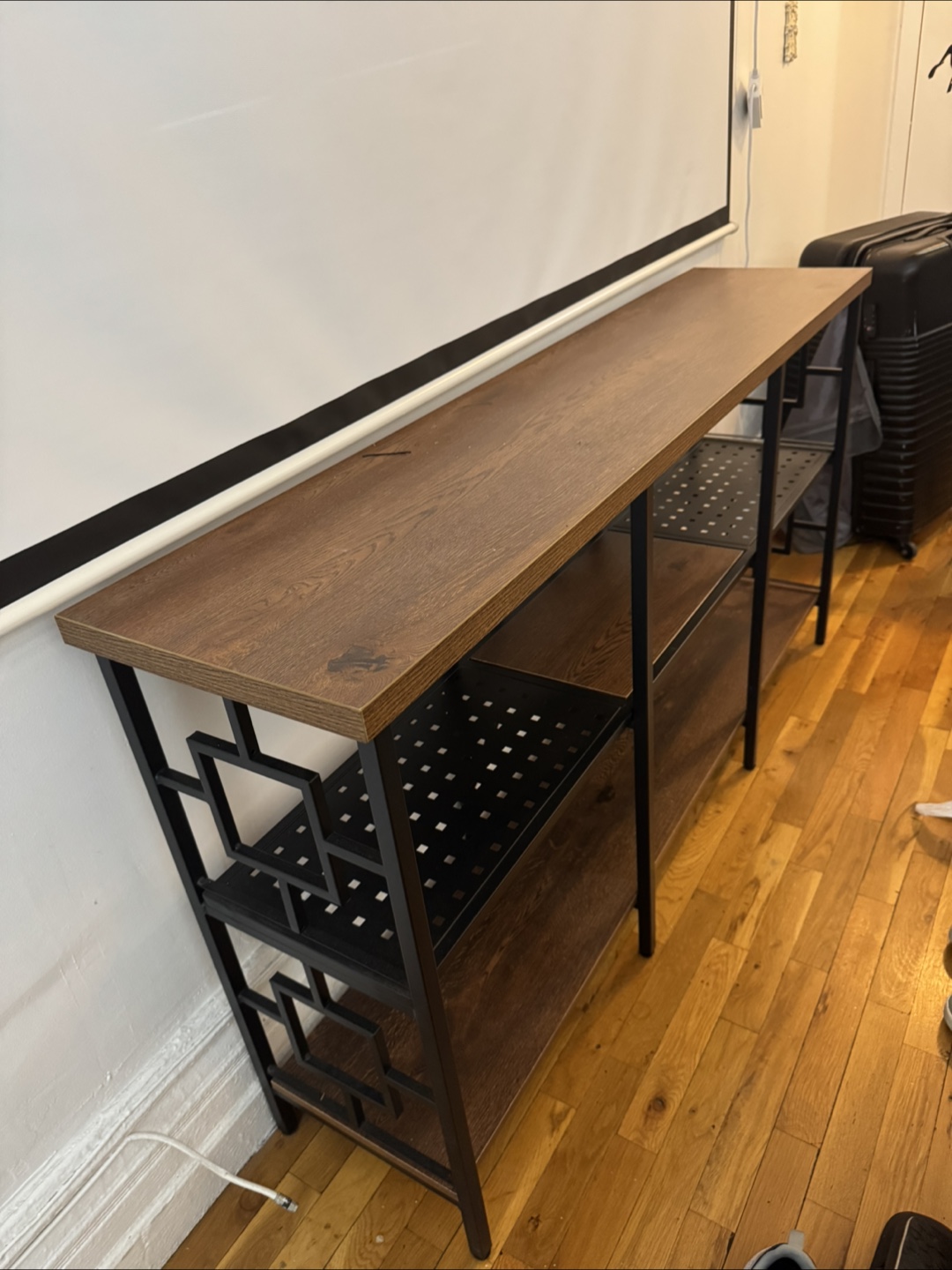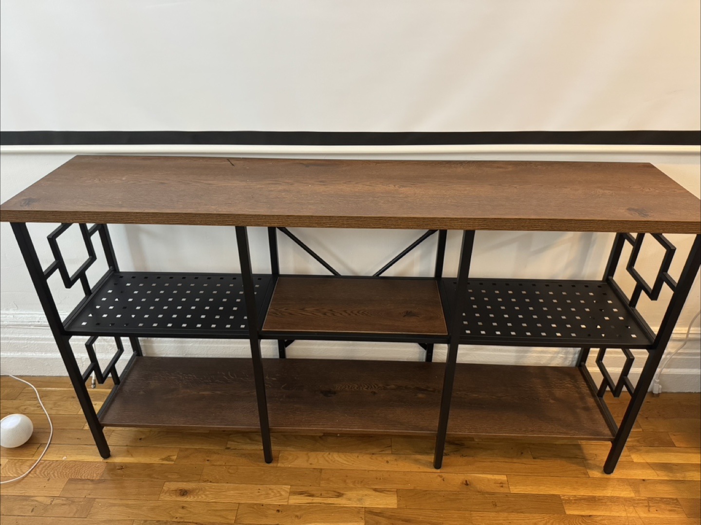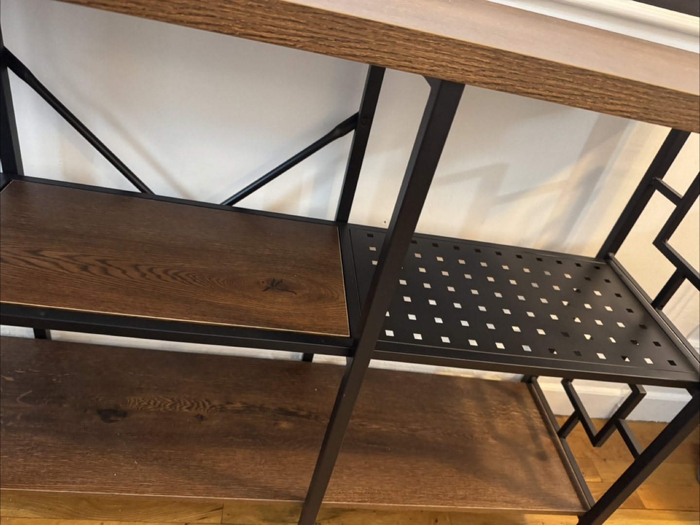 Wooden shelves with a black metal frame. Shelves in a dark brown color. The metal frame has a geometric design on its sides. Would look great filled with your favorite books.