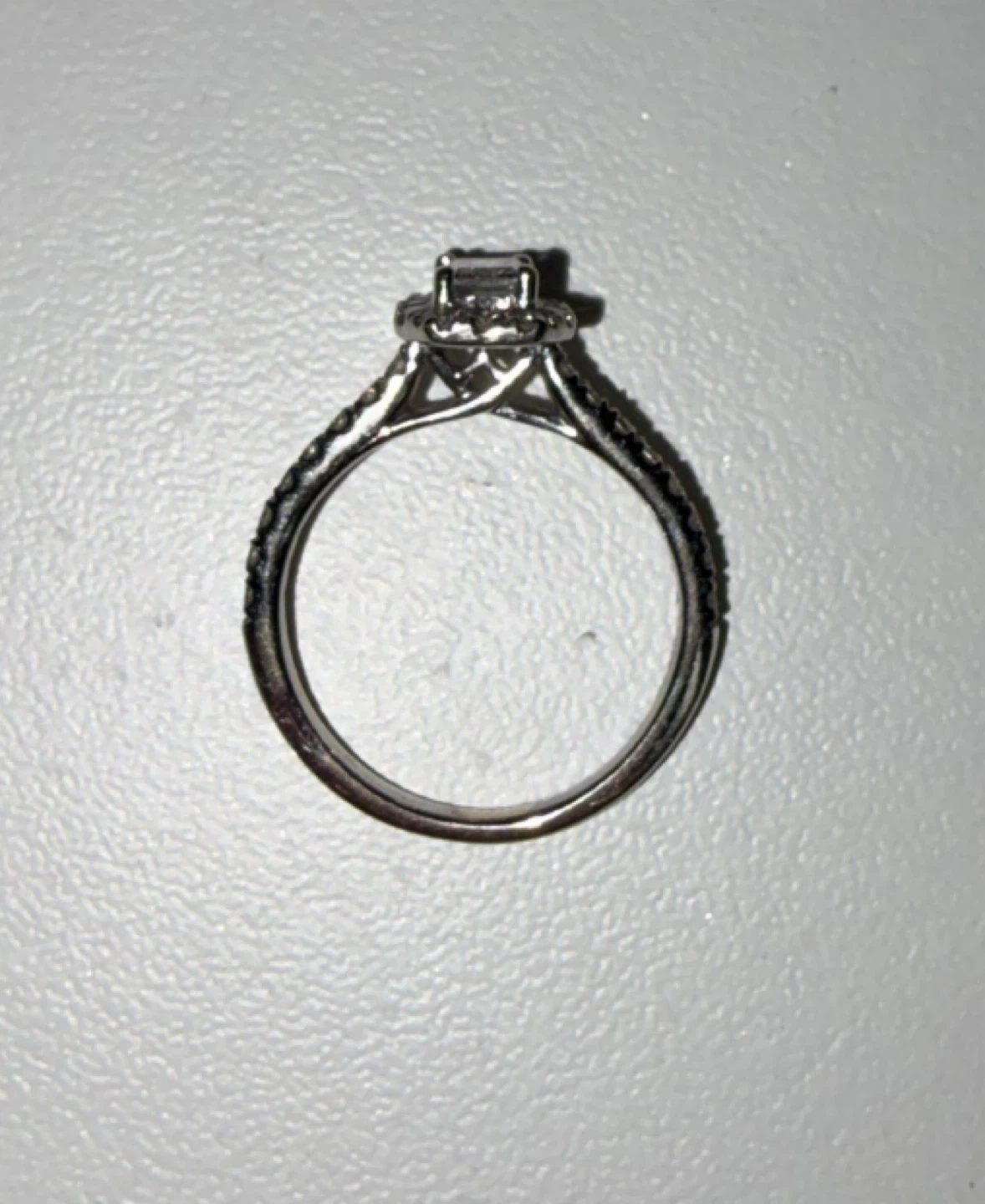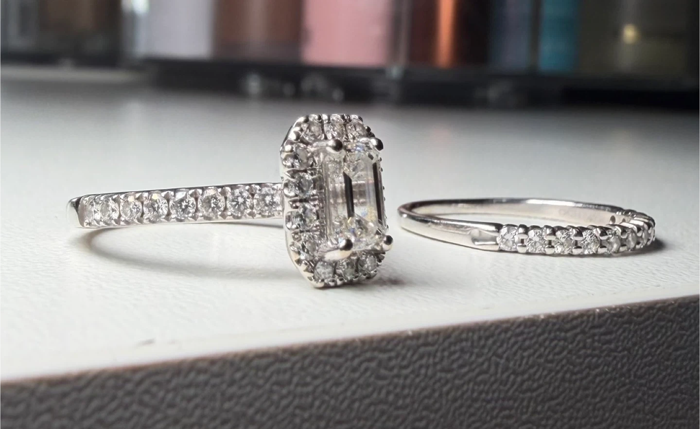 New wedding ring set, size 6.5 Dazzle her with a radiant sparkle that lasts forever with this stunning lab grown diamond engagement ring. Crafted in timeless 14K white gold, this ring boasts emerald-cut center diamond complemented by 46 round brilliant cut lab grown diamonds. Proudly graded with the highest industry standards, each lab grown diamond boasts GCAL-certified greatness.