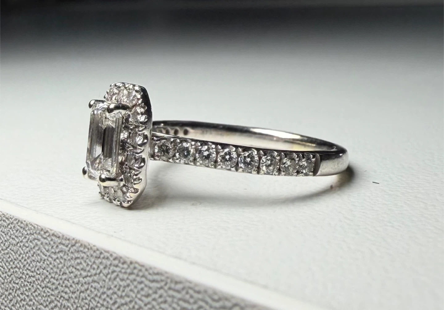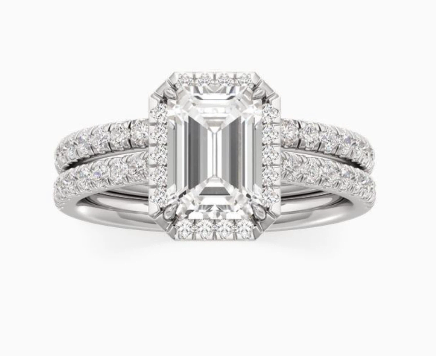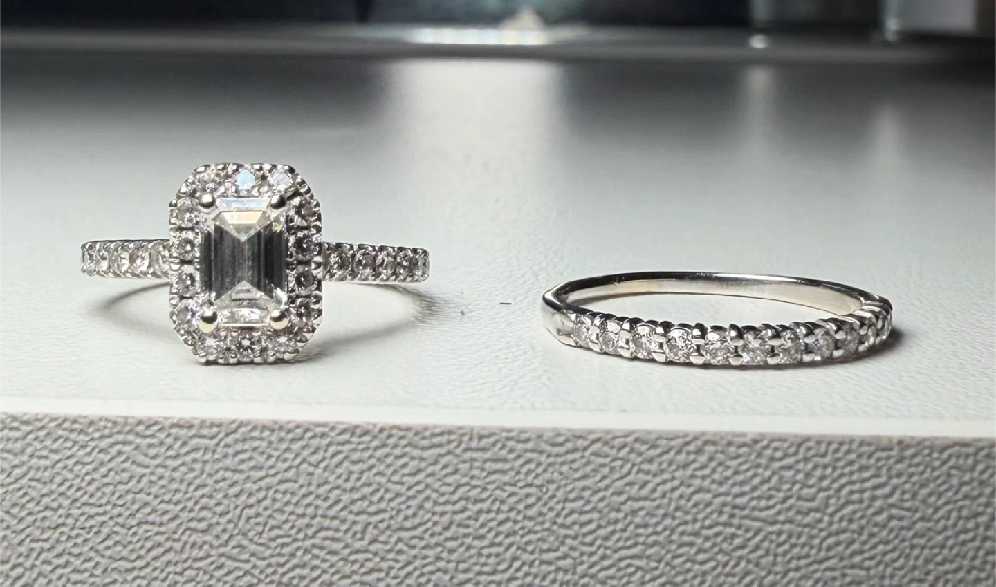 New wedding ring set, size 6.5 Dazzle her with a radiant sparkle that lasts forever with this stunning lab grown diamond engagement ring. Crafted in timeless 14K white gold, this ring boasts emerald-cut center diamond complemented by 46 round brilliant cut lab grown diamonds. Proudly graded with the highest industry standards, each lab grown diamond boasts GCAL-certified greatness.
