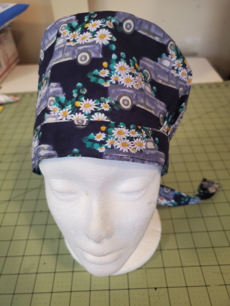 This is a hand Crafted scrub cap with a fun truck and daisy pattern! It's perfect for medical professionals or anyone who needs to keep their hair covered. The cap is in New and ready for a new home
