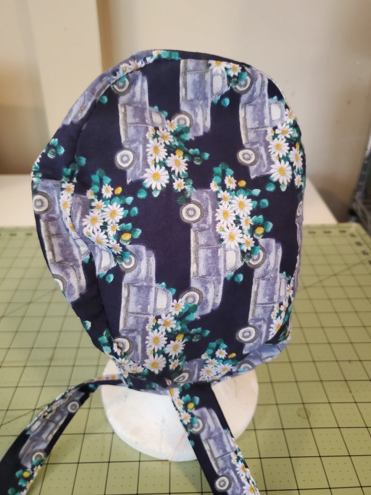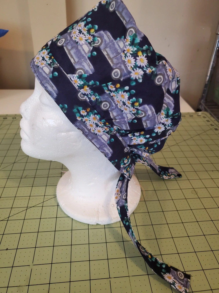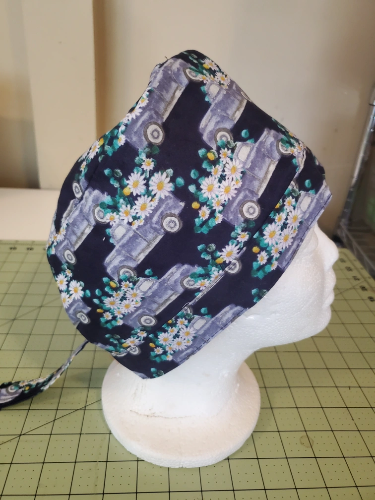 This is a hand Crafted scrub cap with a fun truck and daisy pattern! It's perfect for medical professionals or anyone who needs to keep their hair covered. The cap is in New and ready for a new home