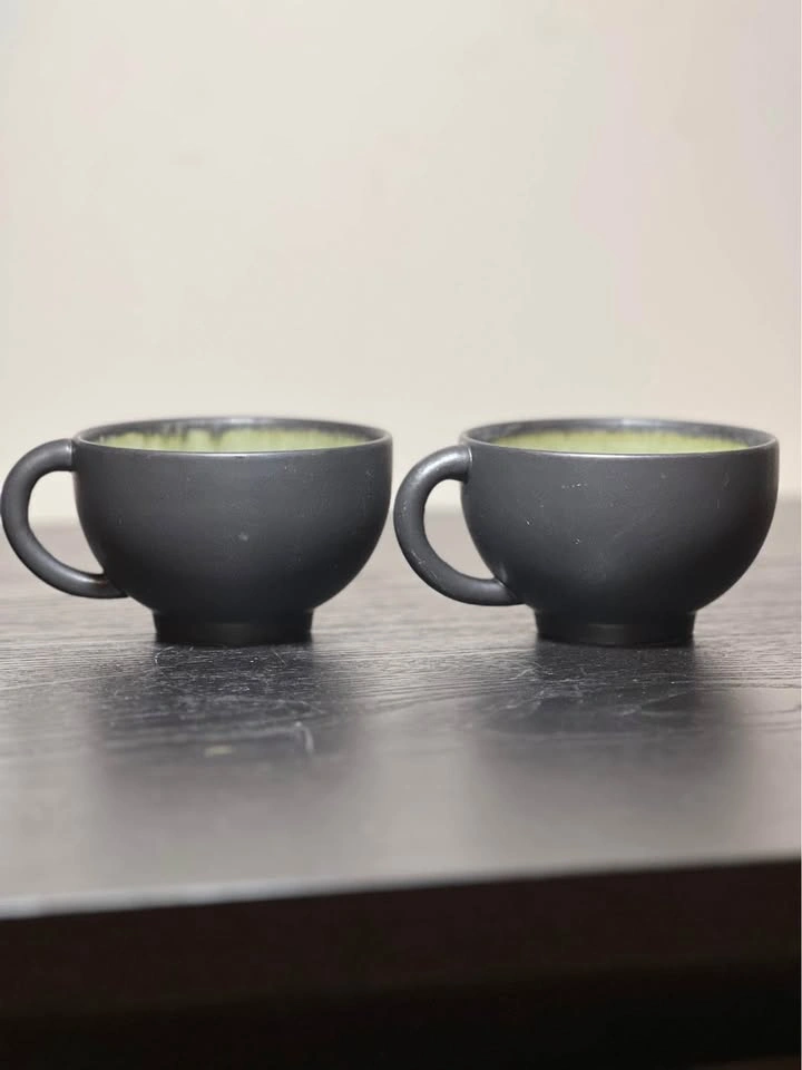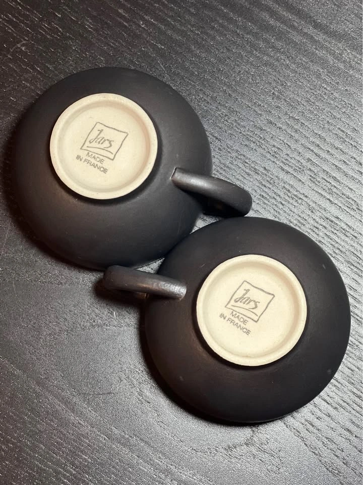 These are Jars France Tourron Samoa Vert coffee or tea cups. They are made of stoneware with a matte black or gray finish on the exterior and a mottled green glazed interior.
