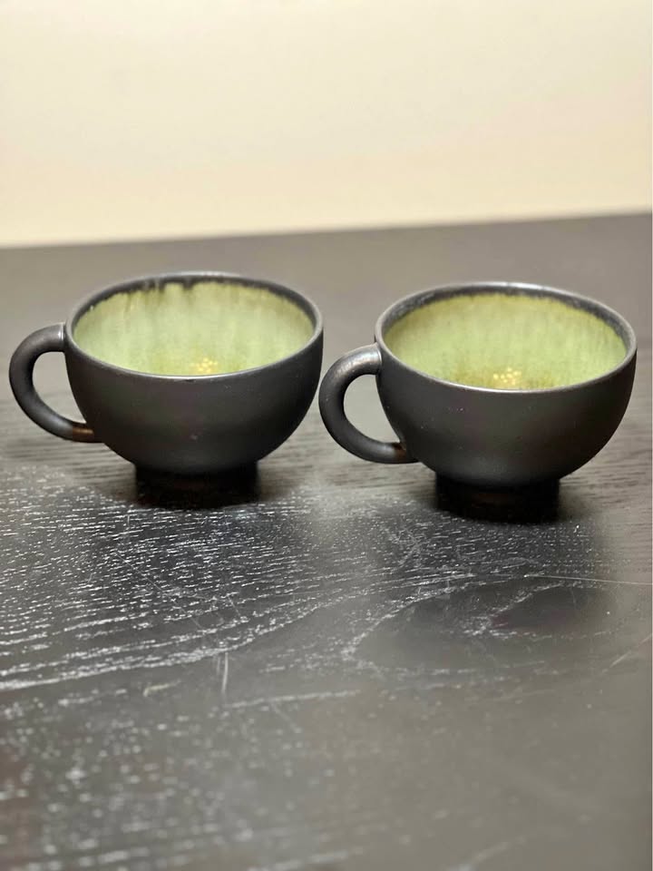 These are Jars France Tourron Samoa Vert coffee or tea cups. They are made of stoneware with a matte black or gray finish on the exterior and a mottled green glazed interior.