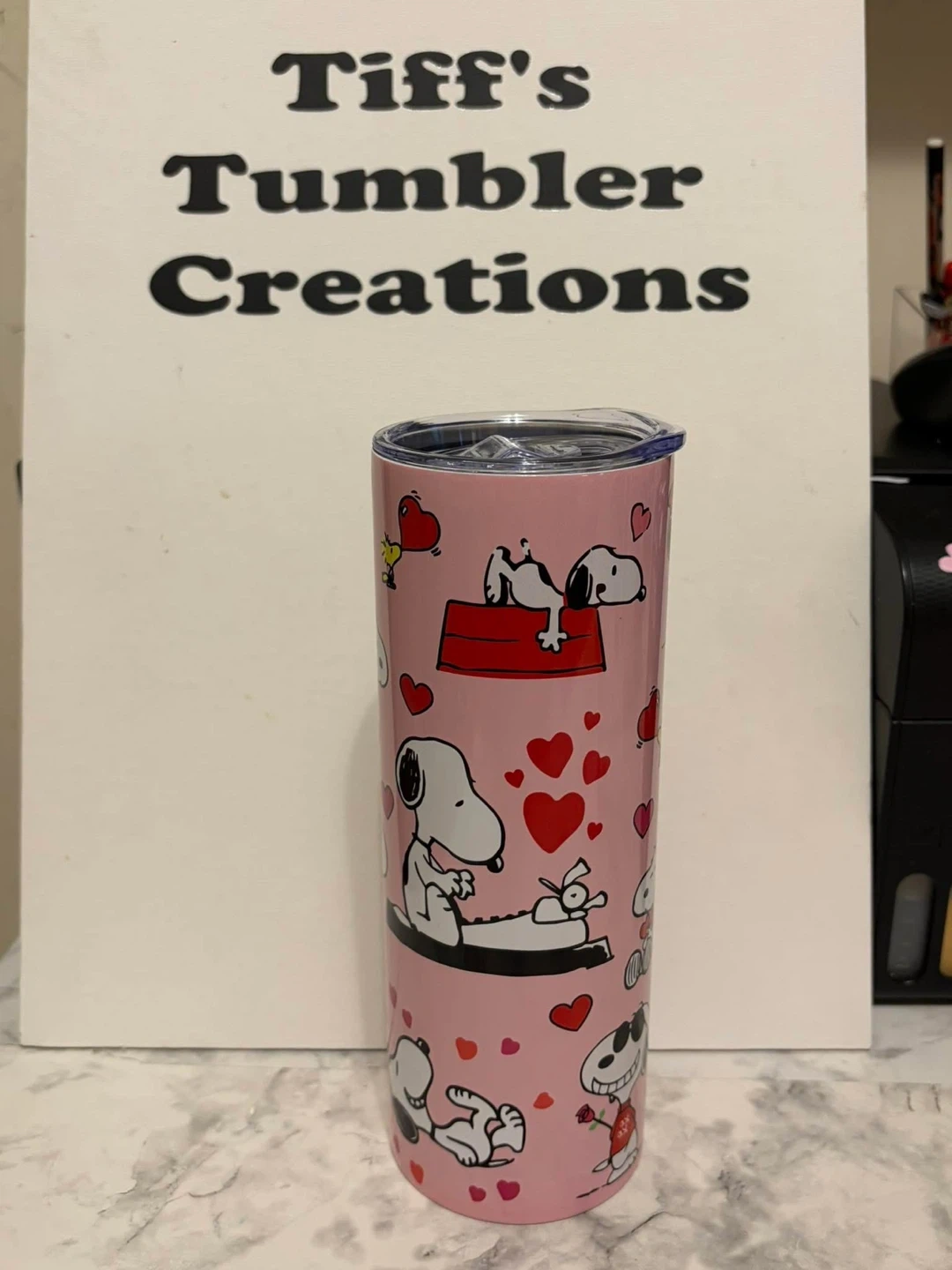 This pink tumbler features a fun Snoopy Valentine's Day design. It's a great way to enjoy your favorite drinks!