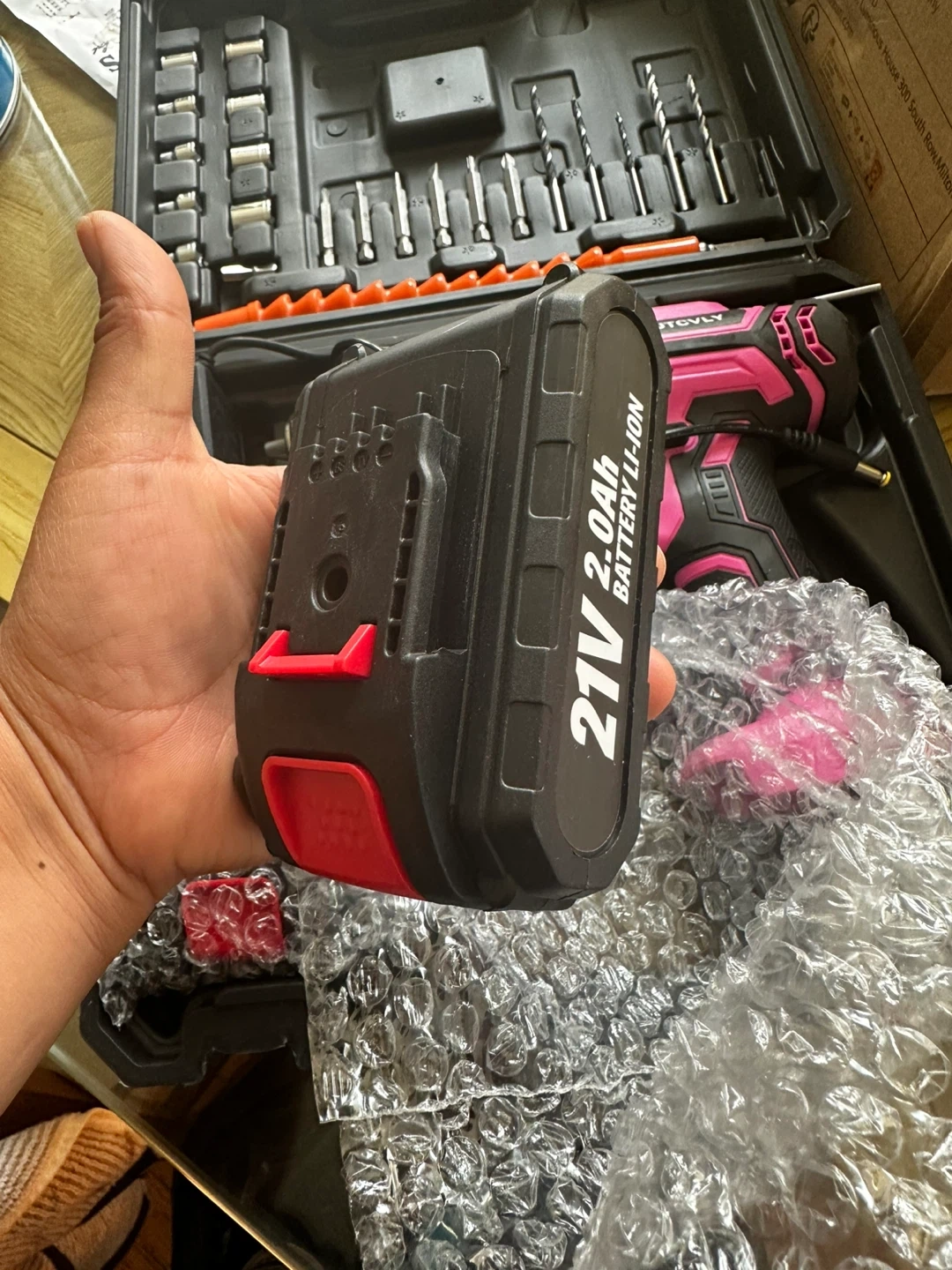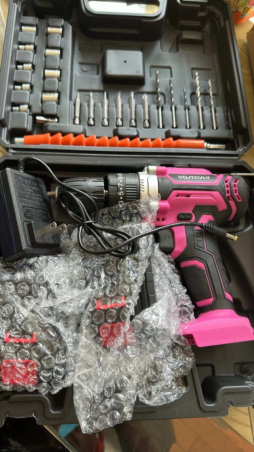 Selling a VOJTCVLY cordless drill set in pink and black! It comes with the drill, charger, and a variety of drill bits and accessories, all neatly organized in a carrying case. Perfect for your DIY projects around the house