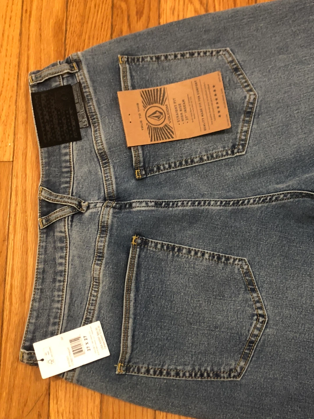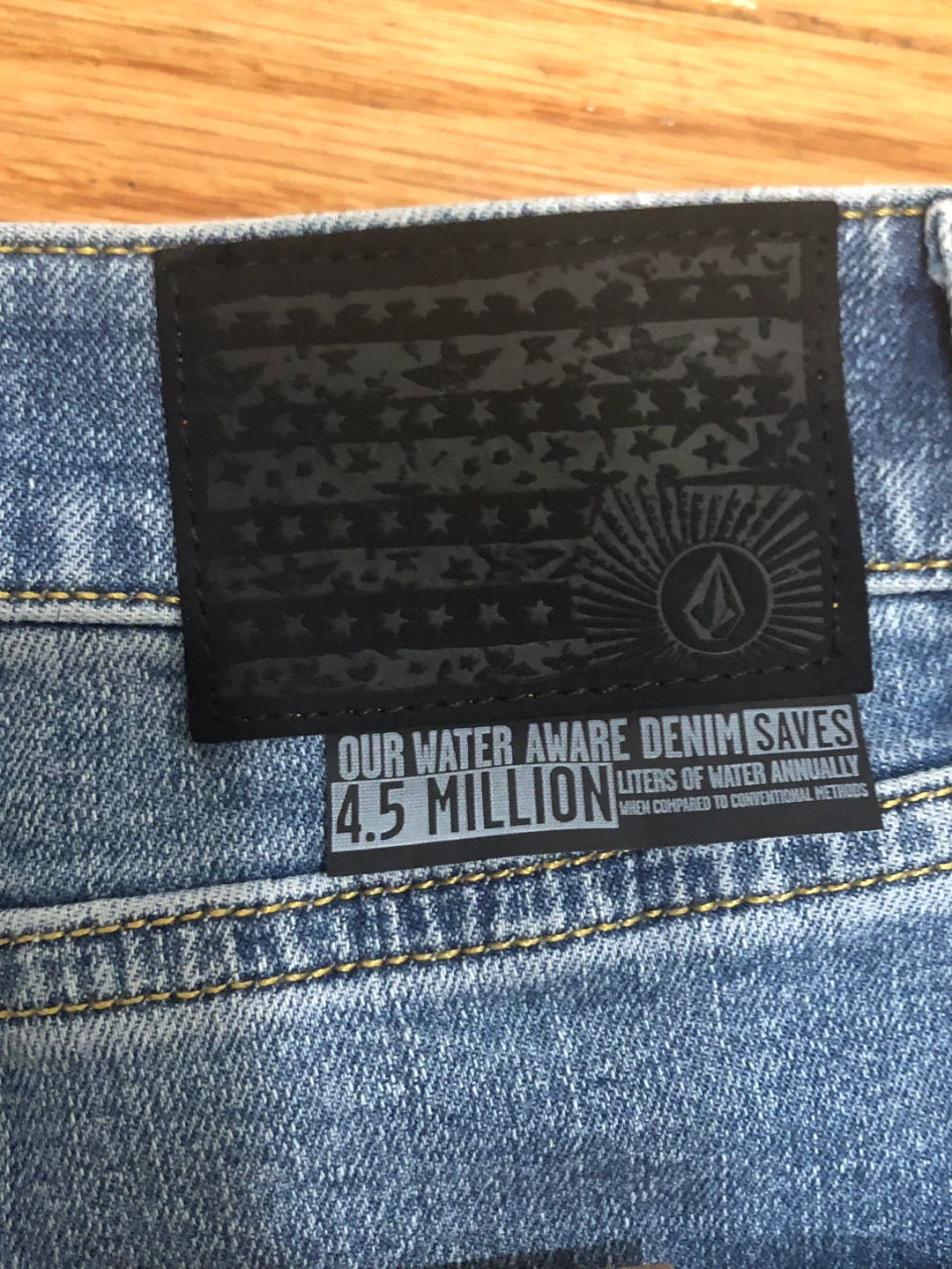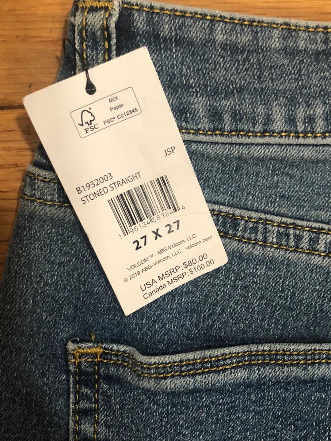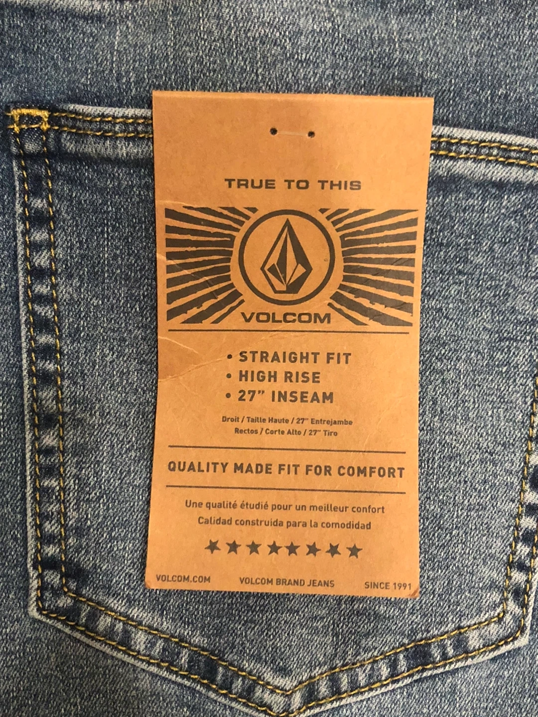 10Volcom jeans with a high rise and straight fit! These are a size 27" x 27" and are made for comfort. The tag says "Quality made fit for comfort" and the denim is water aware, saving 4.5 million liters of water annually compared to conventional methods. MSRP is $80