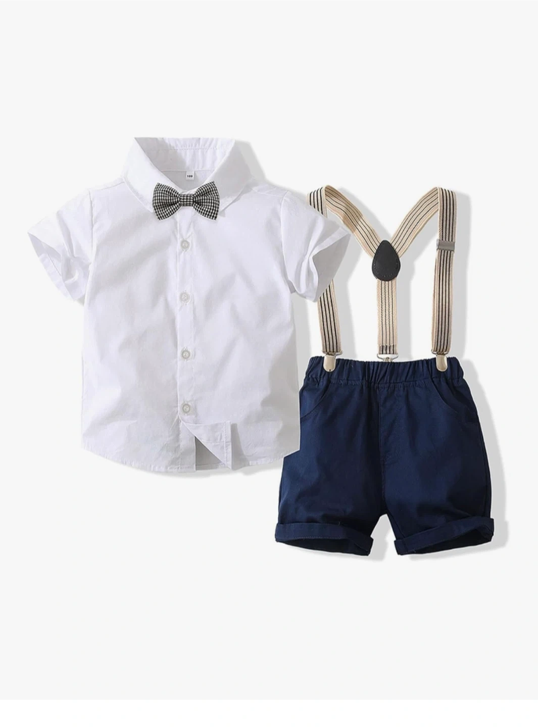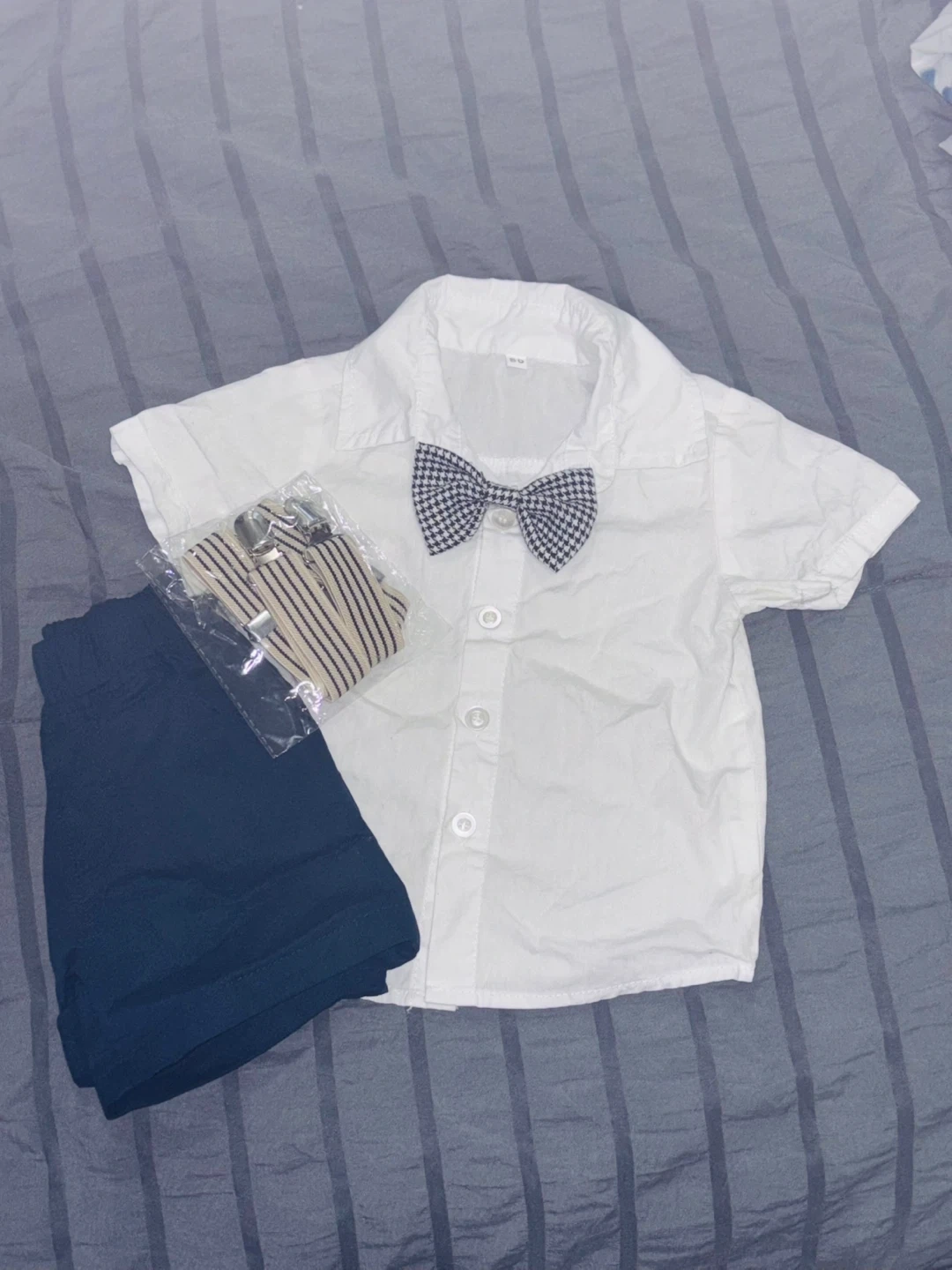 I'm selling a brand new baby boy formal outfit from Volunboy! It includes a short-sleeve white shirt with a bow tie, navy blue shorts, and suspenders. Perfect for an event or special occasion. Size 9-12 months Price $30