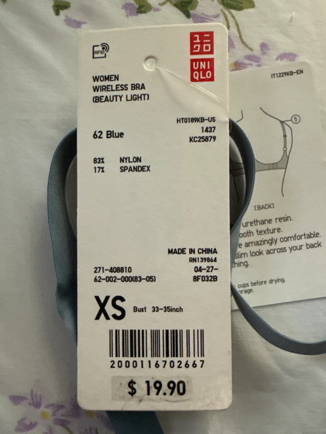 This is a brand new Uniqlo Wireless Bra (Beauty Light) in size XS and the color is blue! The bust size is 33-35 inches. It's made of 83% nylon and 17% spandex. Originally bought for $19.90!