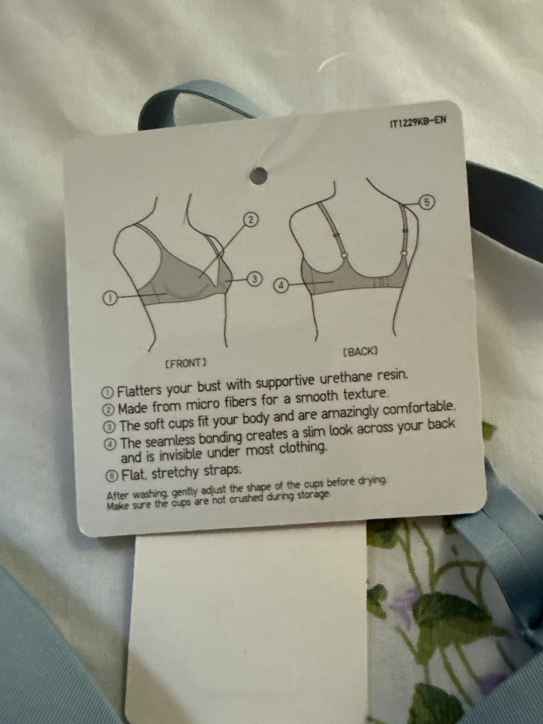 This is a brand new Uniqlo Wireless Bra (Beauty Light) in size XS and the color is blue! The bust size is 33-35 inches. It's made of 83% nylon and 17% spandex. Originally bought for $19.90!