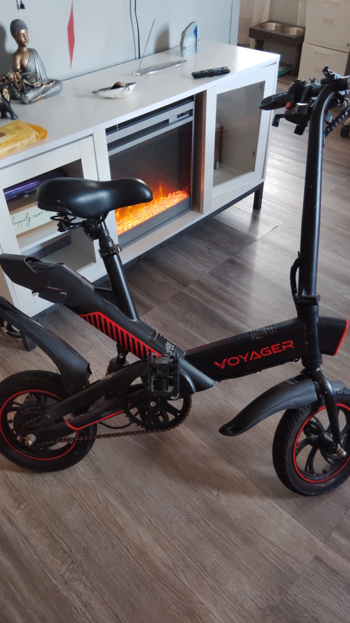 10I'm selling a Voyager folding electric bike in great condition! It's black with red accents. This bike is perfect for commuting or just cruising around town. It's lightweight and easy to fold up for storage or transport. Get ready to enjoy the ride!