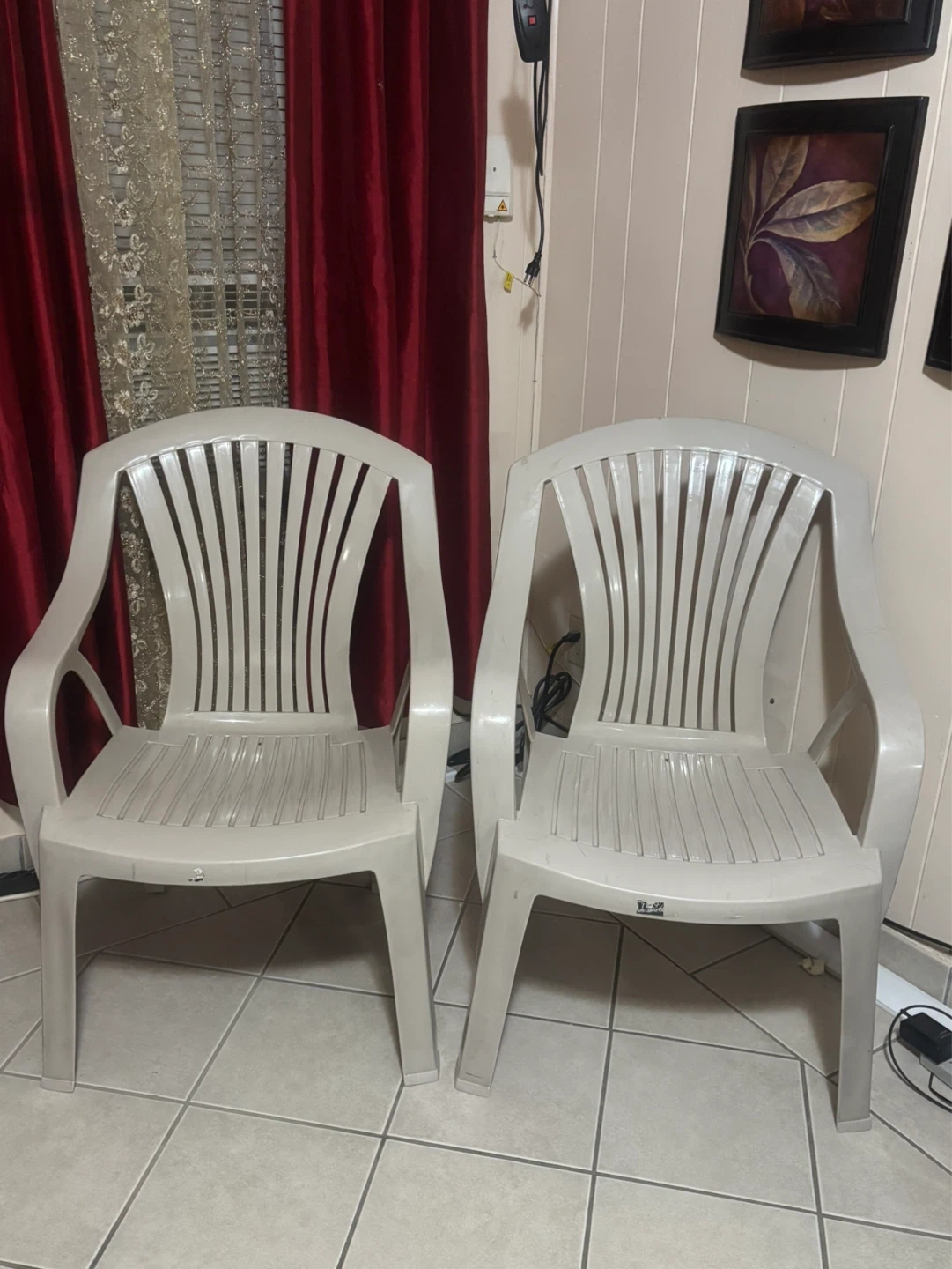 Two plastic chairs, perfect for your outdoor space. They're made of durable plastic. These chairs are great for relaxing on a patio or deck.