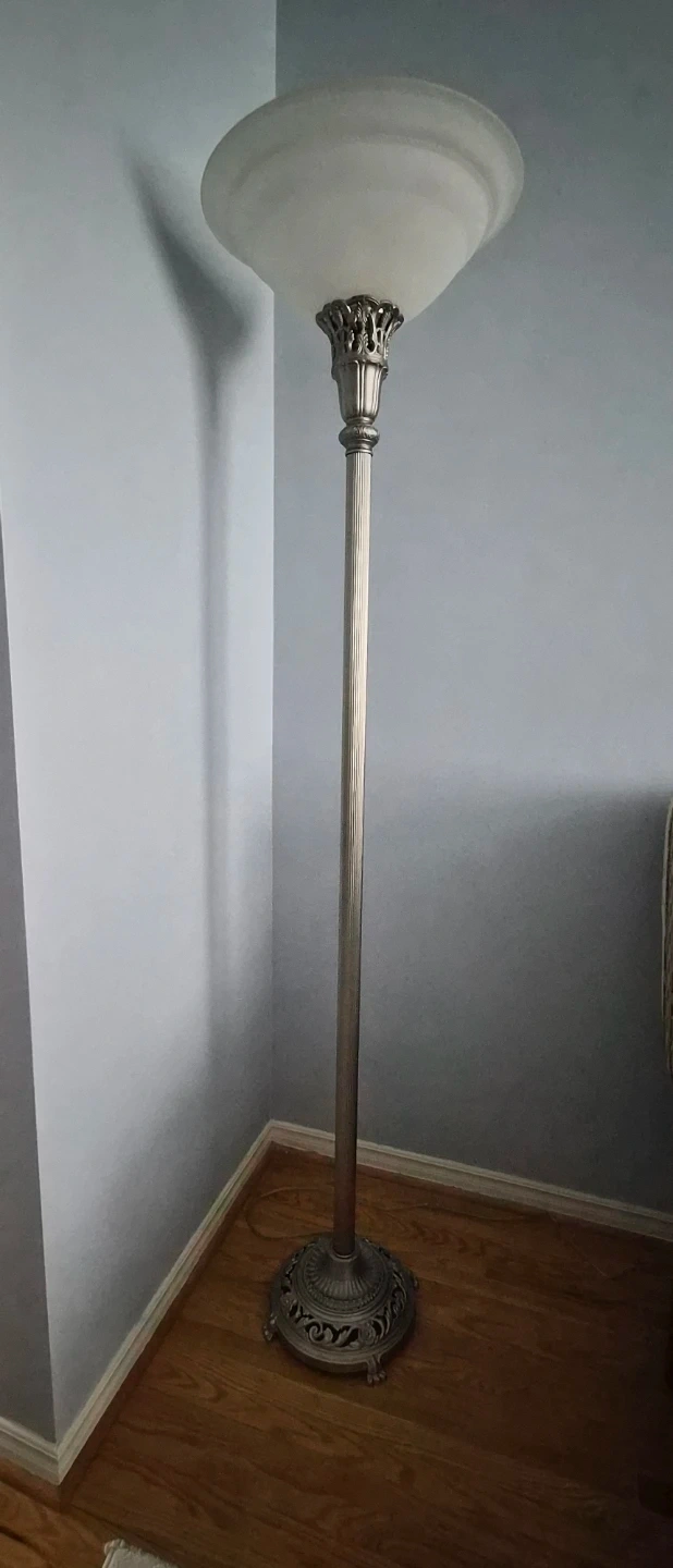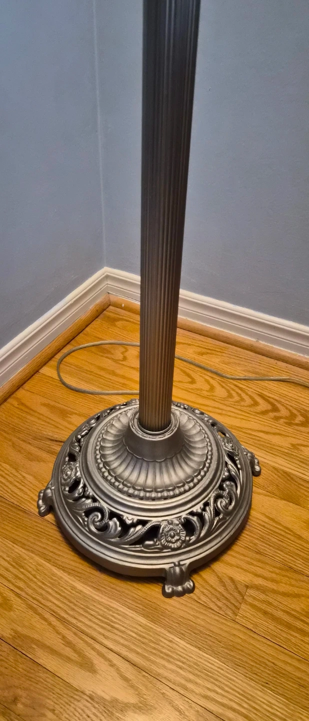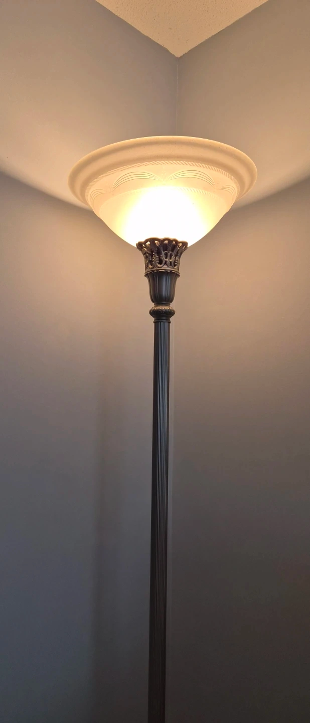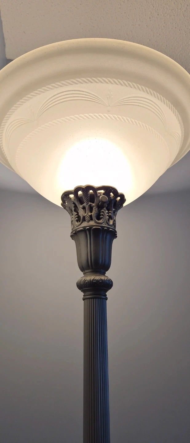 This floor lamp features a frosted glass shade with embossed detailing. It has a decorative metal base and pole in a dark, antique finish. Adds a touch of elegance to any room!