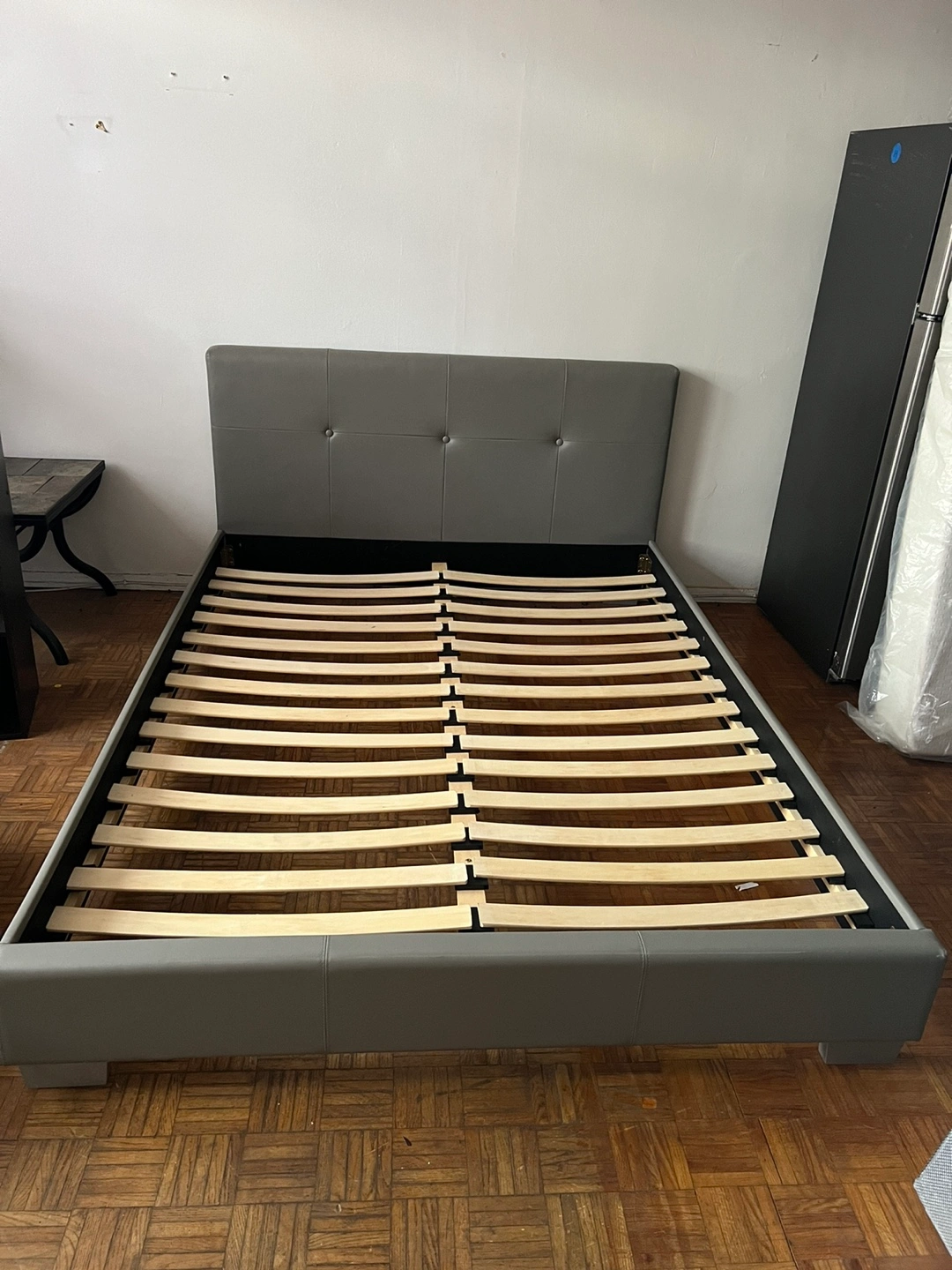 Queen size bed frame with slatted support. Gray faux leather headboard. No mattress included.